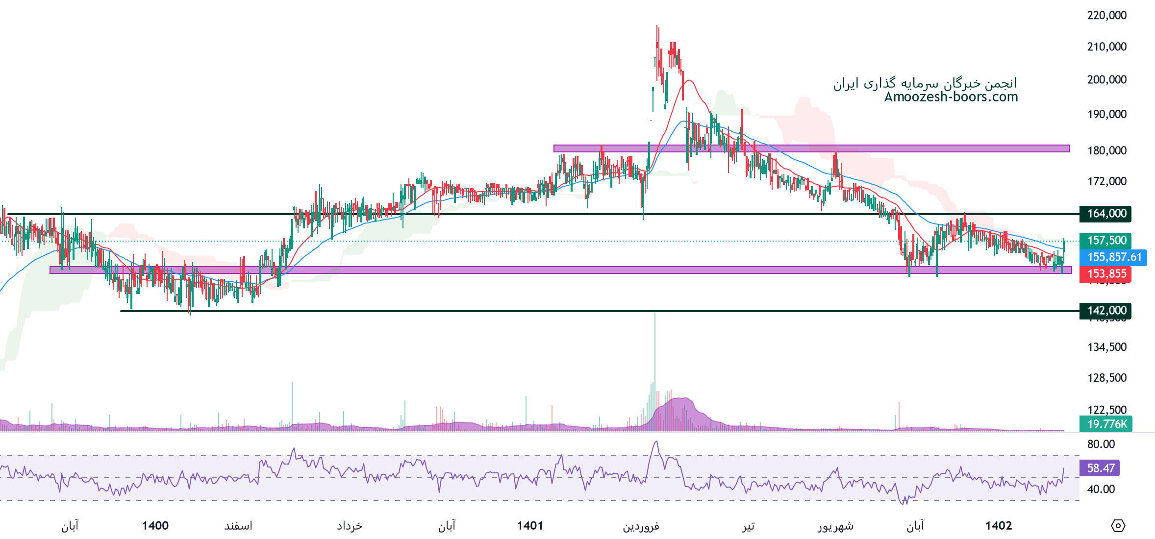 حمایت نماد شوینده از ناحیه پر تراکم 150000 ریال تشکیل شده و در صورت شکست این سطح تا حمایت بعدی سهم شوینده ( 142000 ریال ) 10% فاصله وجود دارد.