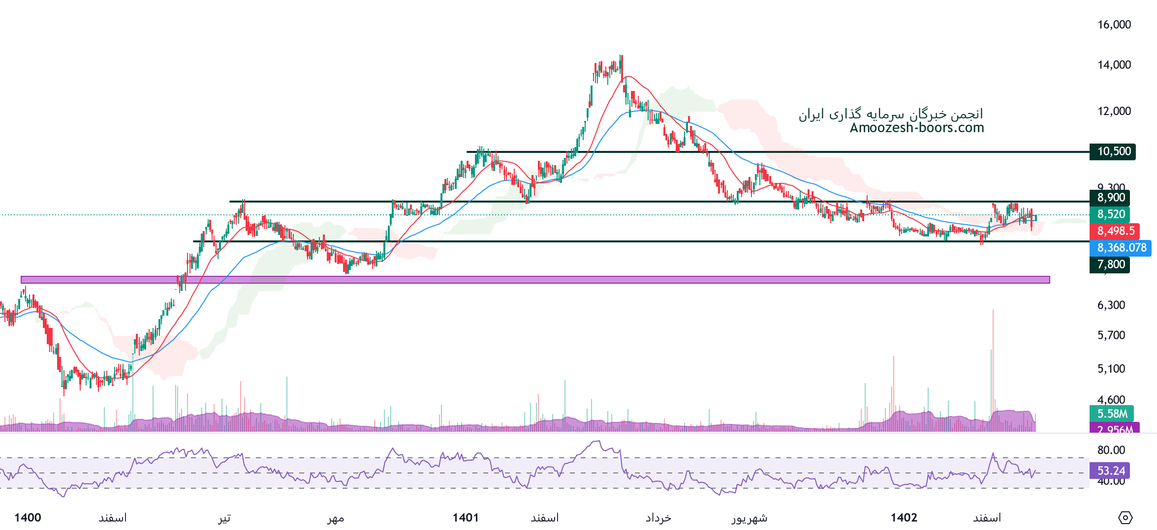 همانطور که در تحلیل تکنیکال مبین میبینیم قیمت در محدوده حمایتی 7800 ریال و محدوده مقاومتی 8900 ریال در حال نوسان میباشد.