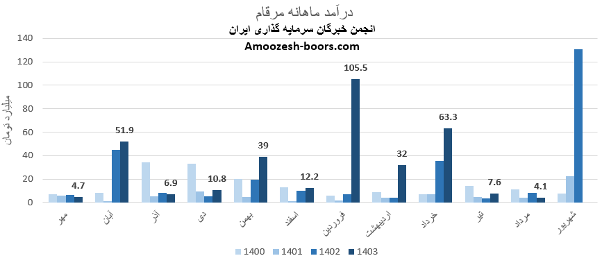 گزارش فعالیت ماهانه نماد مرقام در خرداد ماه سال 1404 نشان میدهد که این شرکت در این بازه زمانی توانسته است به درآمد 63.3 میلیارد تومان دست یابد، این رقم نسبت به ماه مشابه سال گذشته 78 درصد افزایش داشته است؛ همچنین در مقایسه با ماه گذشته و متوسط ماهانه به ترتیب تغییر 98+ و +93 درصد داشته است.