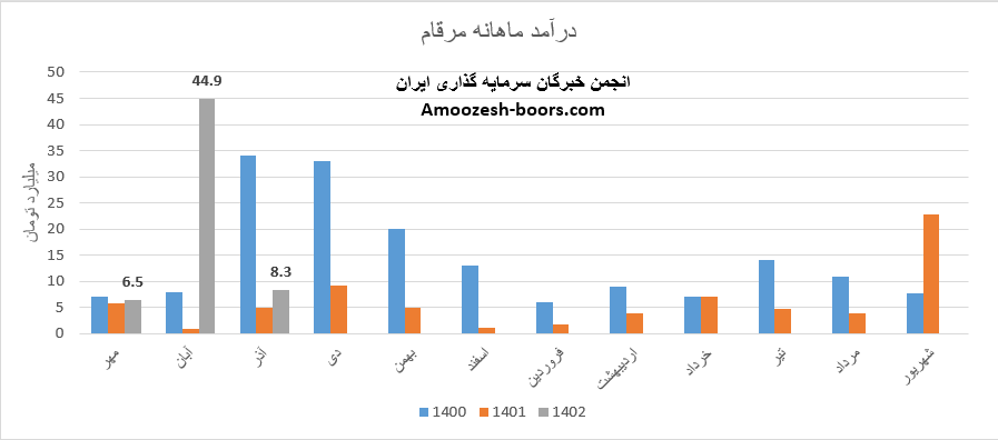 درآمد آبان ماه سال 1402 سهم مرقام 44.9 میلیارد تومان بوده است که در مقایسه با ماه گذشته 591% رشد داشته است.