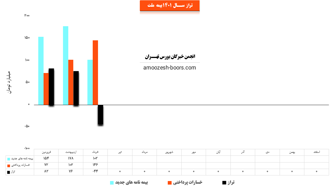 شرکت بیمه ملت با نماد ملت در اردیبهشت ماه سال 1401 حدود مبلغ 178 میلیارد تومان بیمه نامه جدید صادر کرده که این میزان در مقایسه با ماه گذشته 16% افزایش پیدا کرده است.
