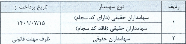 بدینوسلیه برنامه زمانبندی پیشنهادی هیئت مدیره در خصوص پرداخت سود نقدی مربوط به عملکرد سال مالی منتهی به ۱۴۰۰/۱۲/۲۹ به شرح ذیل اعلام می گردد: