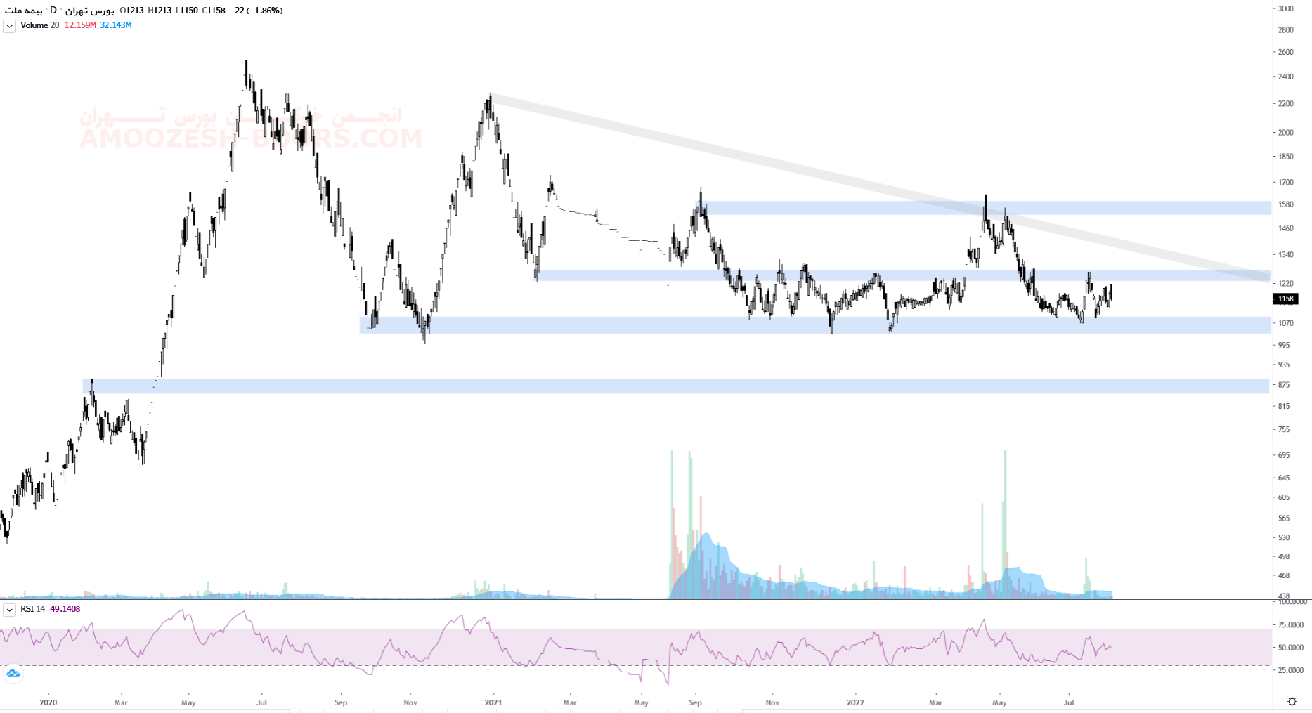 قیمت سهم ملت روند خنثایی را بین ناحیه مقاومتی 125 تومان و ناحیه حمایتی 100 تومان در پیش گرفته است. لذا در صورت شکست مقاومت ناحیه ۱۲۵تومان میتواند رشد خود را تا ناحیه مقاومتی خط روند نزولی و درصورت شکست همچنین مقاومت ناحیه ۱۶۰ تومان ادامه دهد. اما در صورت از دست رفتن حمایت ناحیه ۱۰۰ تومان قیمت می تواند با شتاب بیشتری خود را به ناحیه حمایتی ۸۵ تومان برساند.