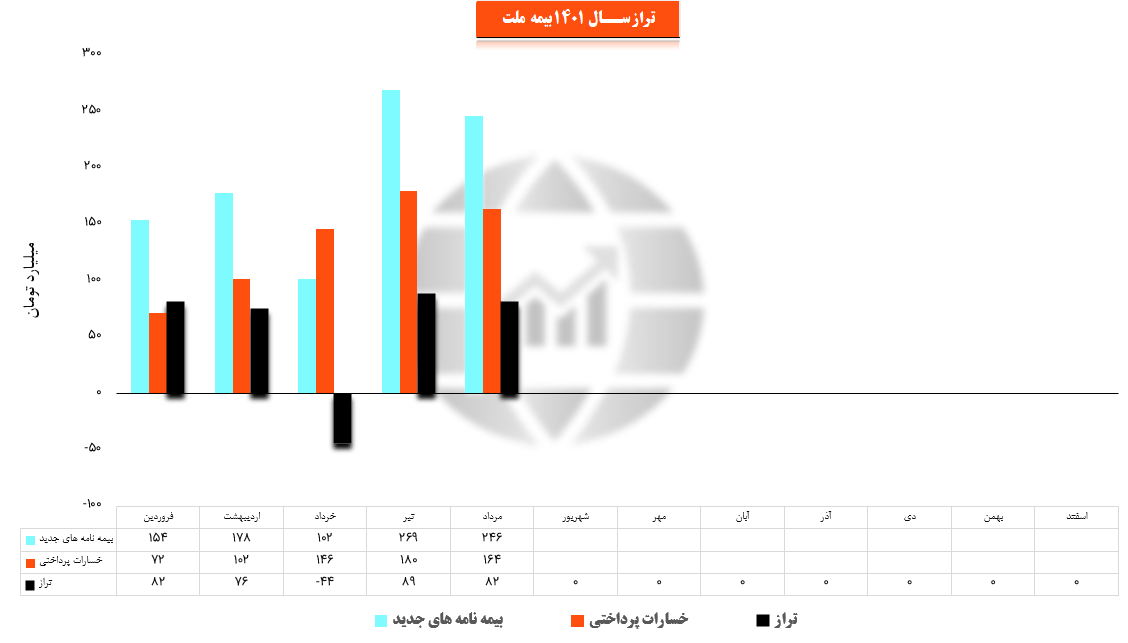 نماد ملت (شرکت بیمه ملت) در مرداد ماه سال 1401 حدود مبلغ 246 میلیارد تومان بیمه نامه جدید صادر کرده که این میزان در مقایسه با ماه گذشته 9% کاهش پیدا کرده است.