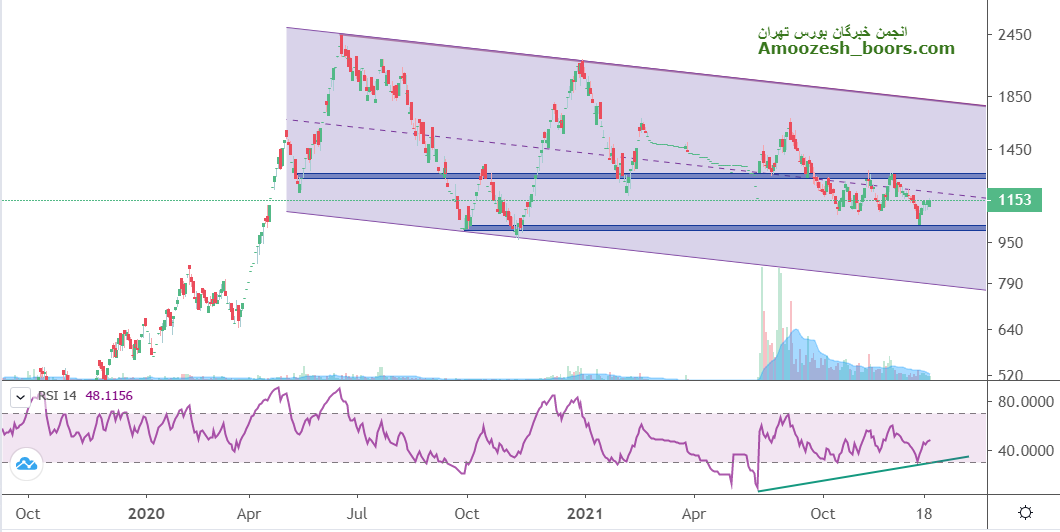 همجنین در بررسی تکنیکالی سهم، قیمت با ایحاد واگرایی مثبت در محدوده حمایت استاتیک واقع شده و محتمل هست مدتی در محدوده 1000 تا 1300 در نوسان باشد .