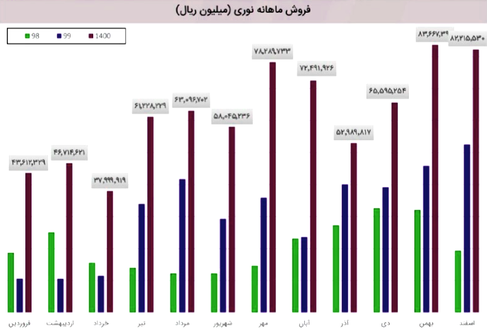 نماد نوری در اردیبهشت فروش فوق‌العاده 78.042 میلیارد ریالی را ثبت کرده است. این مقدار در فروردین سال جاری و مدت مشابه سال گذشته 74.028 و 46.714 میلیارد ریال گزارش شده بود و نسبت به دوره 1 ماهه مشابه سال قبل 67% افزایش داشته است.