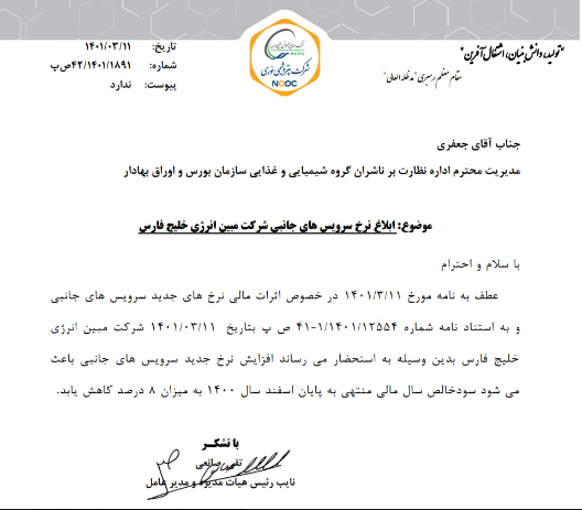 همچنین شرکت طی نامه زیر از افزايش نرخ جديد سرويس هاي جانبي خبر داد که باعث مي شود سودخالص سال مالي منتهي به پايان اسفند سال 1400 به ميزان 8 درصد كاهش يابد.