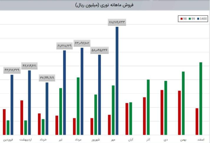 درآمد نماد نوری در مهر 78289 میلیارد ریال و در آبان 72491 میلیارد ریال بوده است شرکت نسبت به دوره 1 ماهه مشابه سال قبل 207% افزایش درآمد داشته است