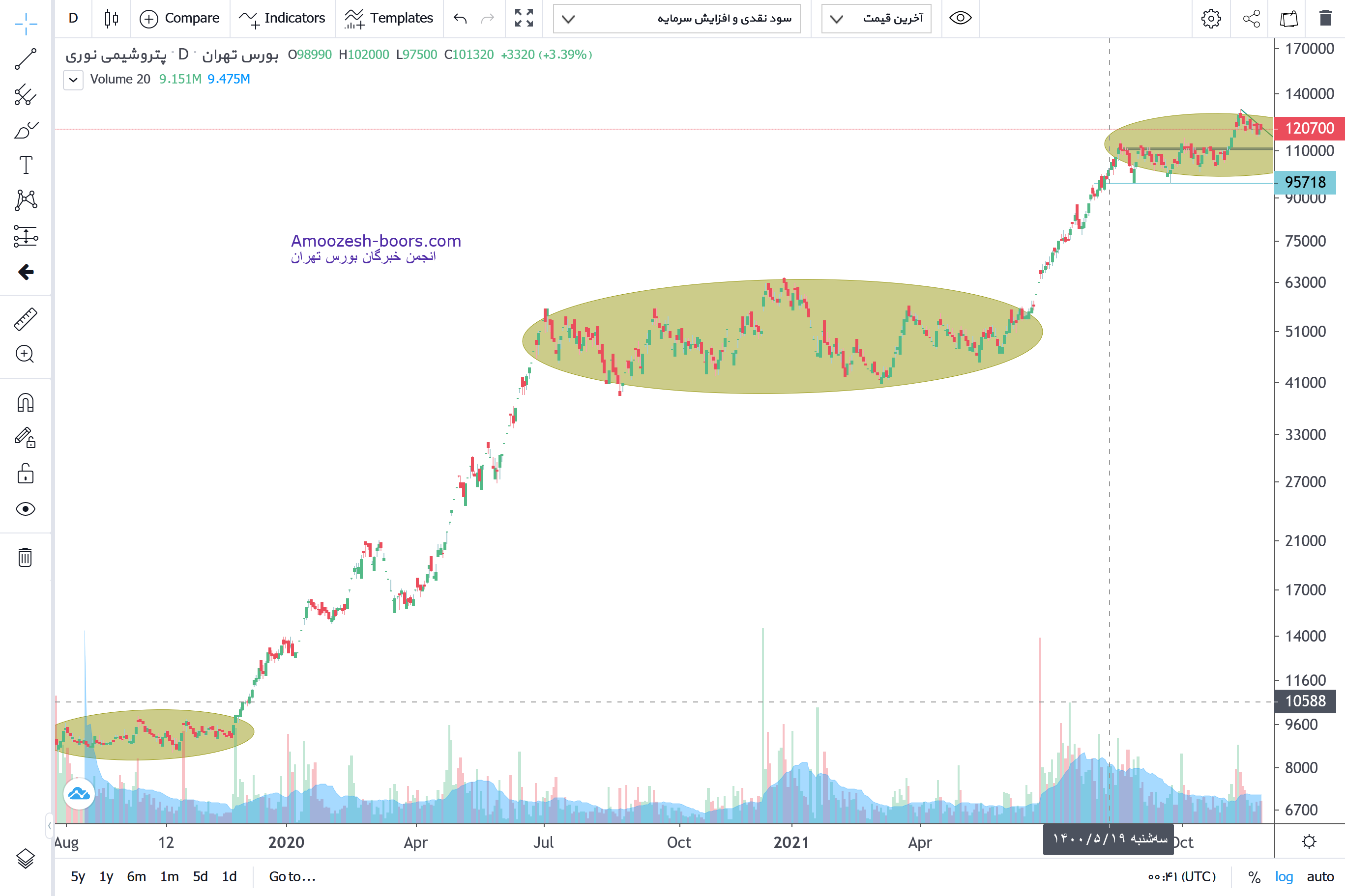 سهم نوری در روند خنثی و محدوده تریدینگ رنج پس از شکست مقاومت استاتیک و تست تارگت اول وارد فاز اصلاحی شده قیمت حمایت 113000 را دارا میباشد که بهترین محدوده ورود پله ای در نظر گرفته میشود با توجه به تکرار رفتار تاریخی چارت، سناریو تریدینگ رنج محتمل میباشد و اولین تارگت قله تاریخی 130000 در نظر گرفته خواهد شد که از کف حمایت استاتیک 15 درصد فاصله قیمتی دارد. همچنین باید در نظرر داشت در صورتی که حمایت 113000 ناشی از فشار فروش از بین رود قیمت میتواند تا حمایت روانی عدد رند 10 هزار تومان به اصلاح قیمتی خود ادامه دهد.