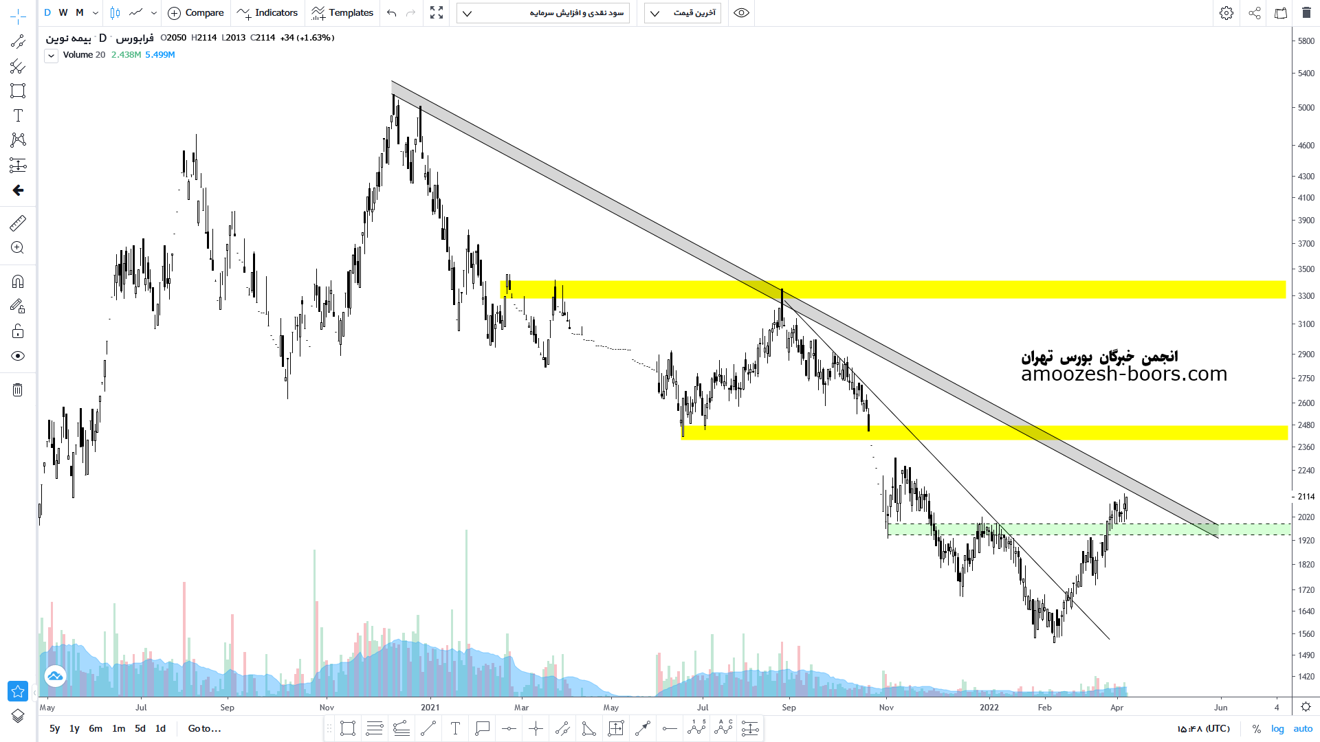 قیمت پس از شکست خط روند نزولی کوتاهمدت خود رشد خود را تا محدوده مقاومتی خط روند نزولی درازمدت خود ادامه داده در صورت شکست این خط روند نزولی و مقاومت مهم میتواند رشد خود را تا محدوده مقاومتی ۲۵۰ تومان ادامه دهد اما در صورت بروز واکنش منفی نسبت به این محدوده مقاومتی مهم محدوده حمایتی ۱۹۵ تومان را پیش روی خود دارد.