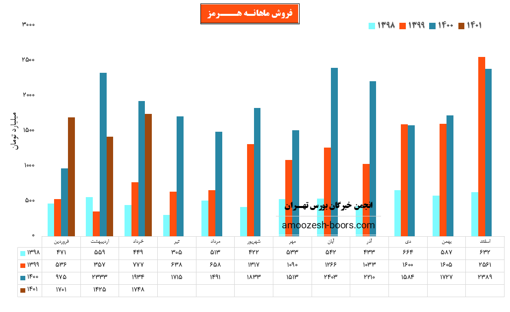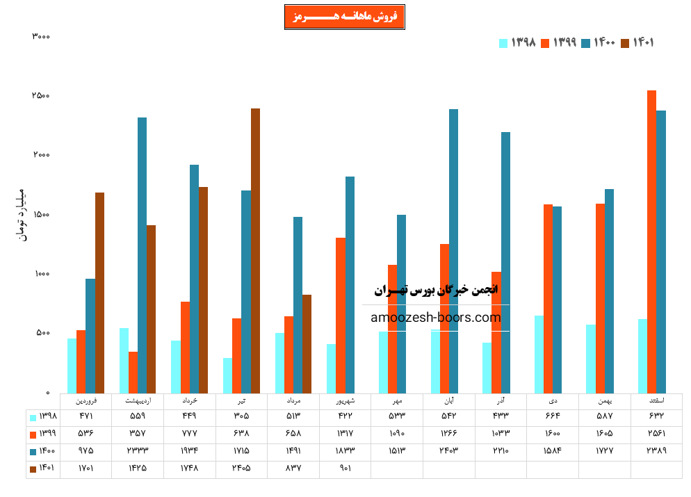 نماد هرمز در مرداد ماه حدود بیش از 56 هزار تن فروش داشته که کل آن فروش داخلی بوده و هیچ فروش صادراتی در این ماه انجام نشده است. درنهایت در مجموع 56 هزار تن فروش ماه جاری حدود 60 درصد در مقایسه با حجم فروش ماه گذشته کاهش پیدا کرده است.