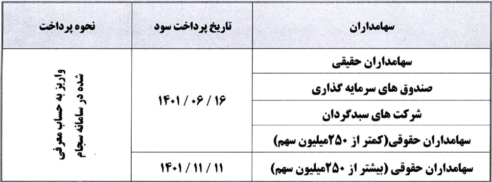 سود نقدی مصوب مجمع عمومی عادی سالیانه با همکاری شرکت سپرده گذاری مرکزی اوراق بهادار و تسویه وجوه از طریق سامانه جامع اطلاعات مشتریان( سجام) پرداخت خواهد شد. لذا از سهامداران محترمی که تاکنون ثبت نام خود را در سامانه سجام نهایی ننموده اند درخواست می گردد در اسرع وقت نسبت به ثبت نام و یا تکمیل مشخصات در سامانه مذکور اقدام نمایند.