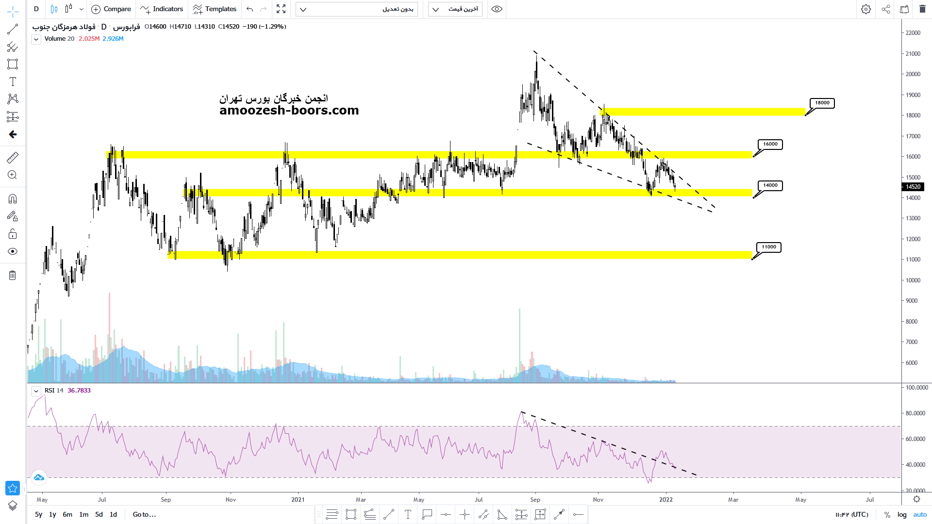قیمت در حال فشرده شدن در انتهای الگوی اصلاحی میباشد که با توجه به قرار گیری آن بر روی محدوده حمایتی 1400 تومان، درصورت حمایت و رشد، با شکست سقف الگو میتواند تا محدوده 1600 تومان رشد کند اما درصورت عدم حمایت و شکست این محدوده حمایتی، اصلاح بیشتر تا محدوده 1100 نیز ادامه خواهد داشت