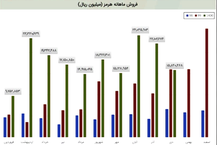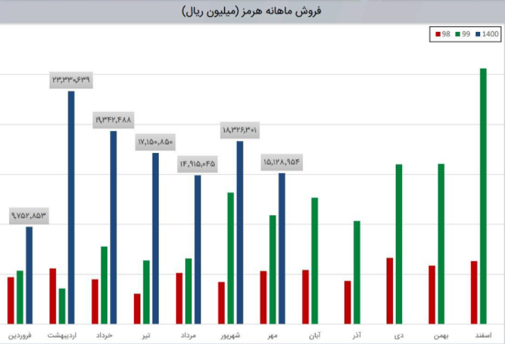 هرمز در آذر 1400 مبلغ 2210 میلیارد تومان درامد داشته که این میزان نسبت به ماه گذشته 8% افت و همچنین نسبت به مدت مشابه سال گذشته 114% رشد پیدا کرده است!