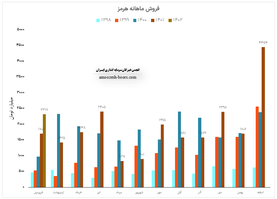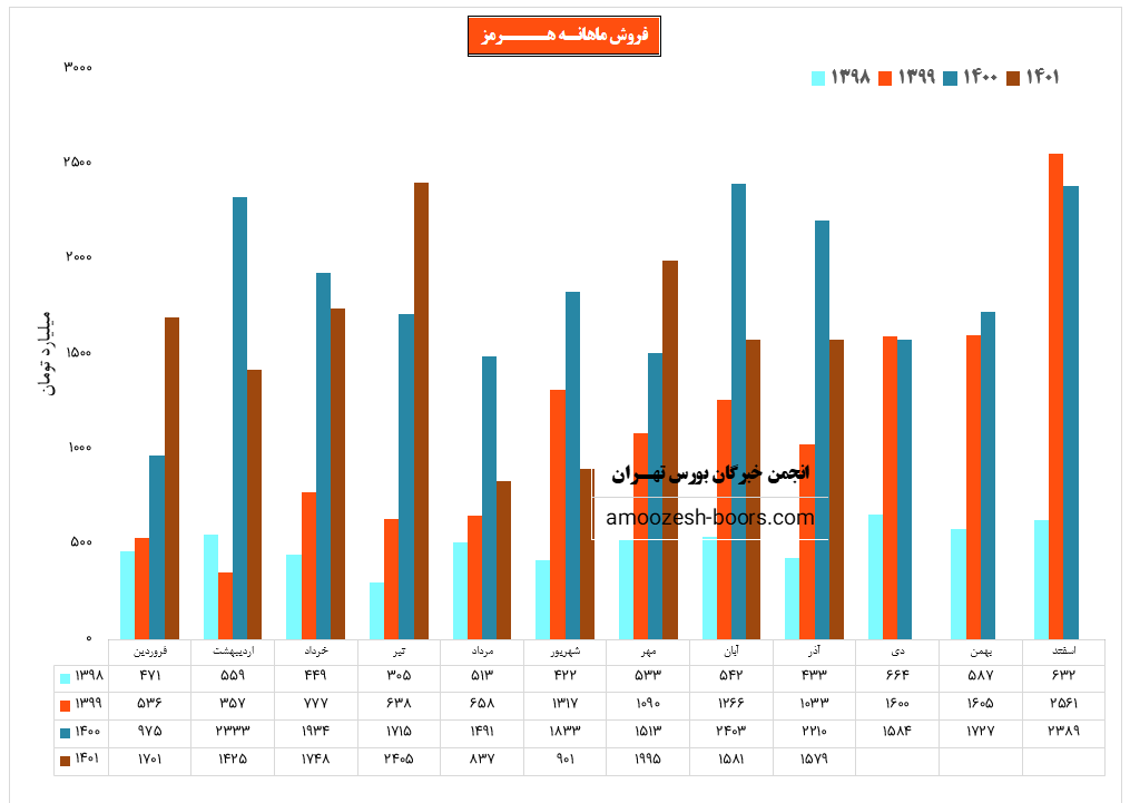 نماد هرمز در فروردین ماه حدود بیش از 80 هزار تن فروش داخلی و همچنین حدود بیش از 34 هزار تن فروش صادراتی داشته که در مجموع 114 هزار تن فروش ماه جاری حدود 59 درصد در مقایسه با حجم فروش ماه گذشته کاهش پیدا کرده است.