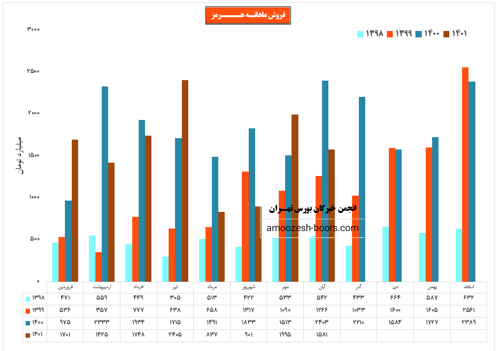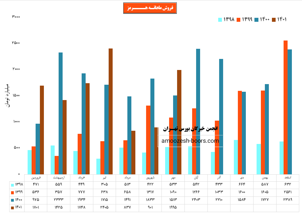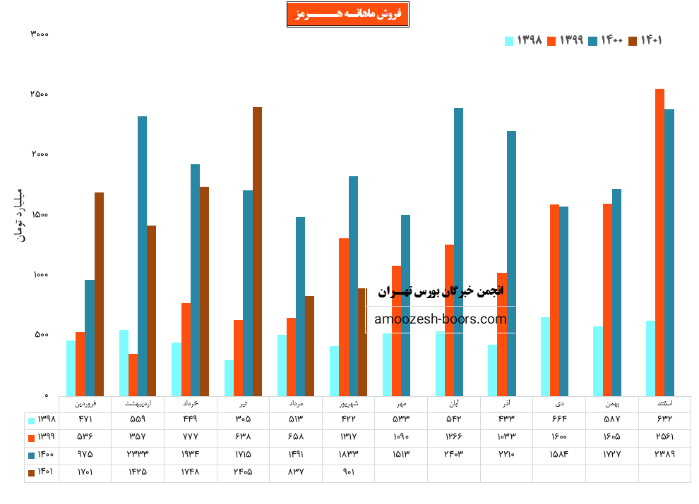 نماد هرمز در آبان ماه حدود بیش از 109 هزار تن فروش داخلی و همچنین حدود بیش از 18 هزار تن فروش صادراتی داشته که در مجموع 128 هزار تن فروش ماه جاری حدود 13 درصد در مقایسه با حجم فروش ماه گذشته کاهش پیدا کرده است.