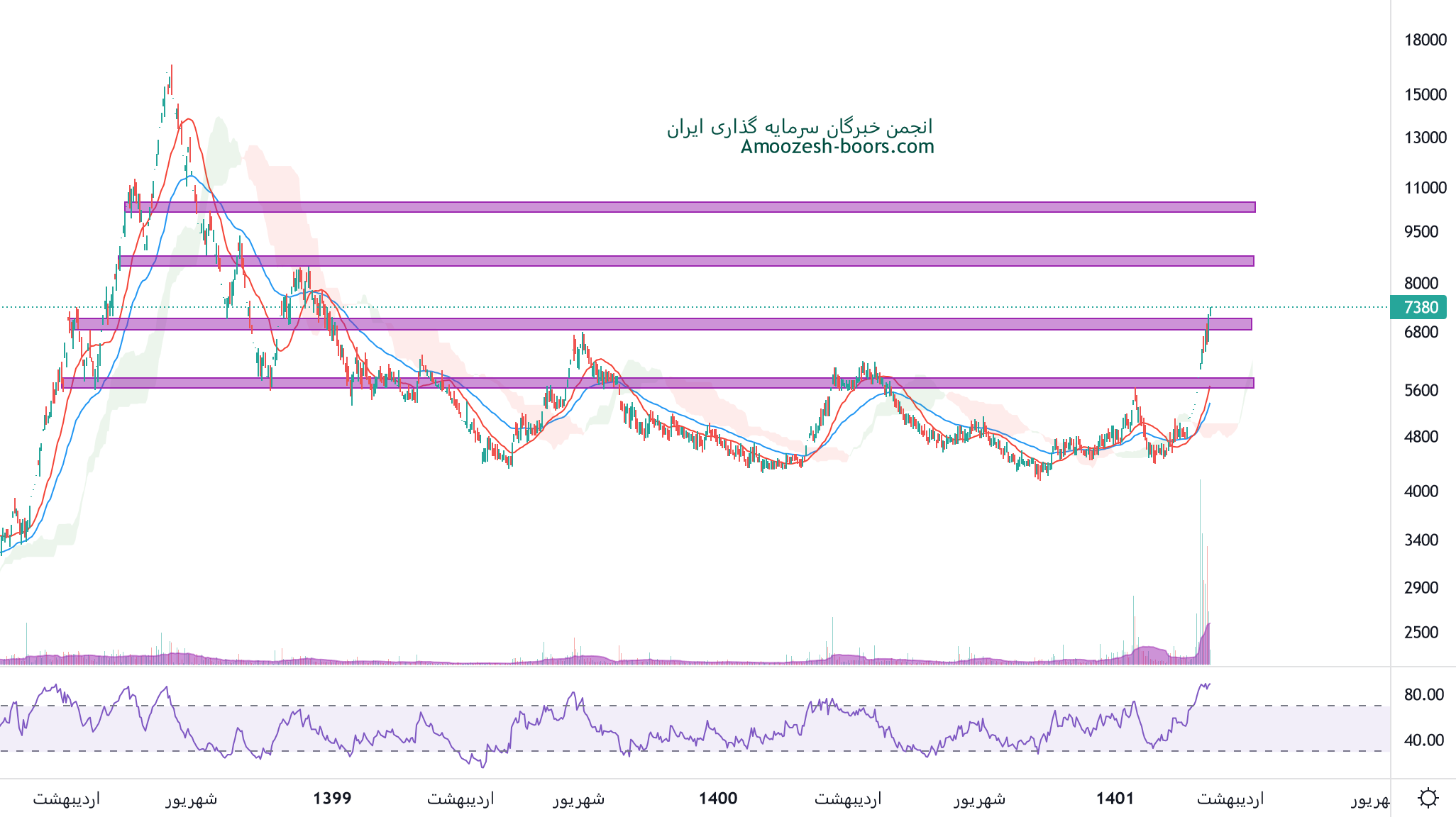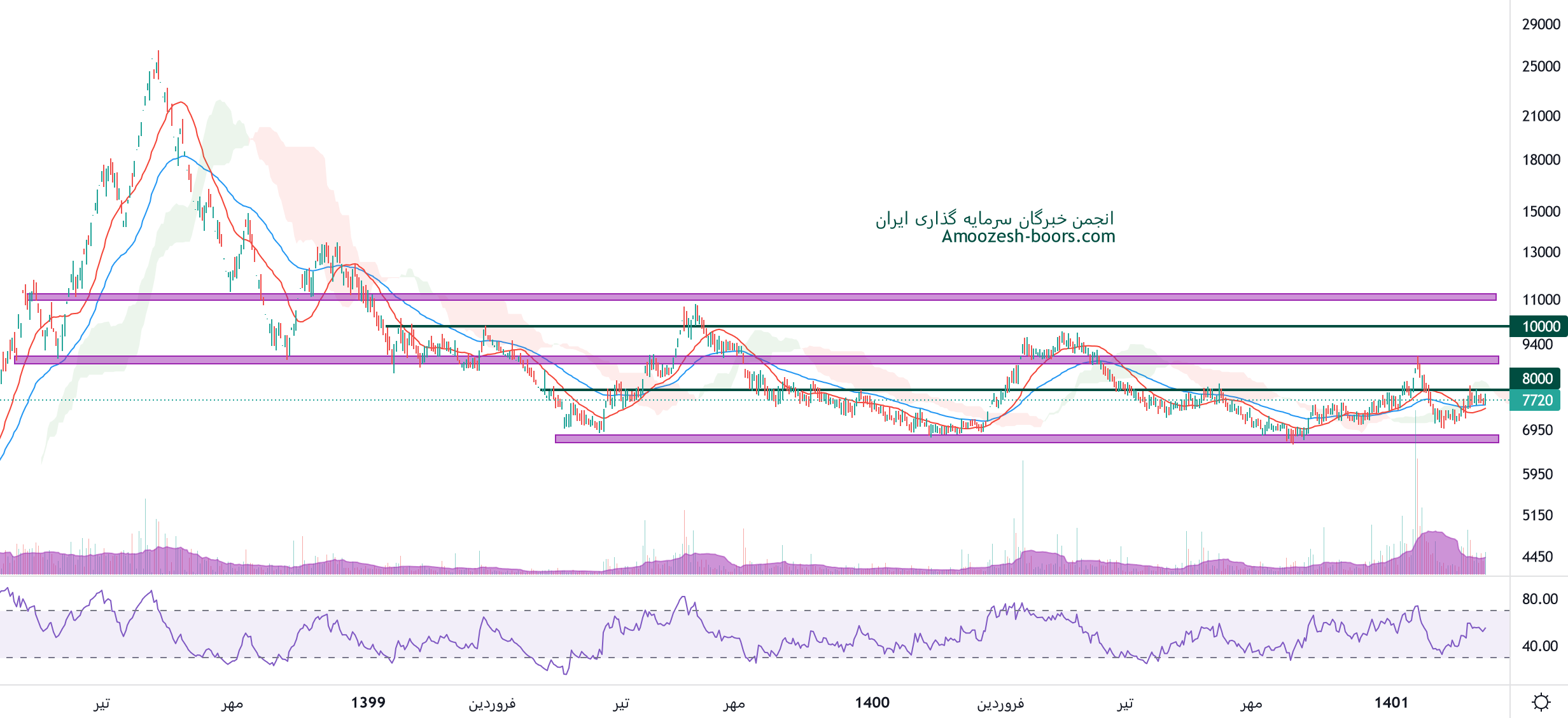 نماد همراه درگیر مقاومت 8000 ریال میباشد، در صورت ادامه دار شدن فشار تقاضا و عبور قیمت از این سطح، مقاومت های بعدی سهم همراه 9000 و 10000 ریال ارزیابی میگردند، همچنین در صورت ورود سهم به فاز اصلاحی، کف حمایتی سهم 6700 ریال در نظر گرفته خواهد شد.