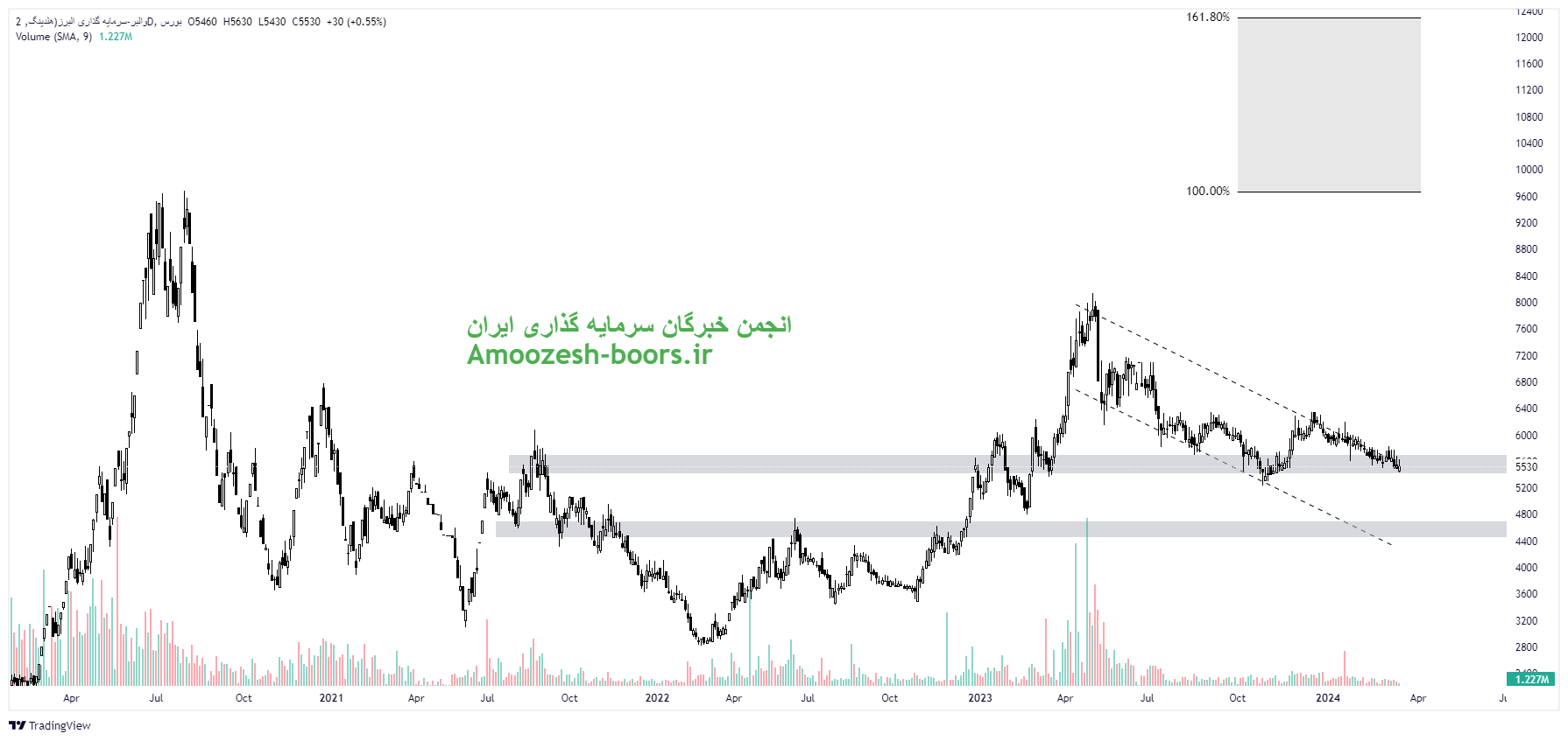 قیمت سهم والبر پس از تست دوباره ناحیه مقاومتی ۶۵۰ تومان وارد اصلاح شده لذا در همین راستا اولین حمایت سهم والبر ناحیه 500 الی 520 تومان در نظر گرفته شده است که میتواند باعث صعودی شدن مجدد روند شود. همچنین در صورت شکست ناحیه 660 تومان مقاومت بعدی سهم والبر ناحیه 1000 تومان تعیین شده است.