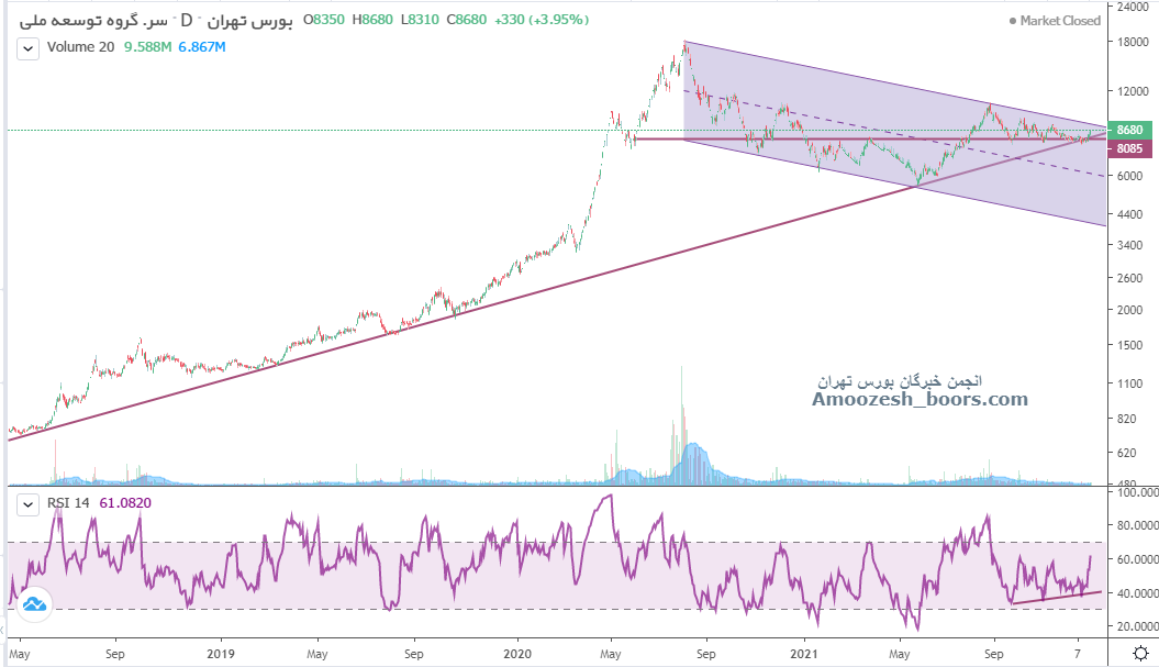 سهم در منطقه حمایتی 7800 یک ناحیه معتبری داشته که با توجه به واگرایی مثبت ایجاد شده ، تثبیت قیمت درین منطقه را محتمل مینماید همچنین در صورت تثبیت قیمت ، مقاومت های 9000 و 10000 به ترتیب بر سر راه سهم وجود دارد.