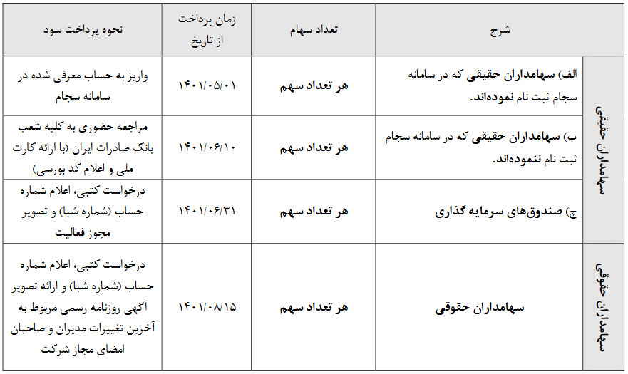 به اطلاع کلیه سهامداران محترم نماد وبصادر می رساند، با توجه به برگزاری مجمع عمومی عادی سالیانه وبصادر دوره مالی منتهی به پایان اسفند ۱۴۰۰ در تاریخ ۱۴۰۱/۰۴/۲۳ ، برنامه زمانبندی پرداخت سود سهام سهامداران وبصادر حقیقی و حقوقی که در تاریخ مذکور سهامدار بانک می باشند، به شرح جدول ذیل اعلام می گردد:
