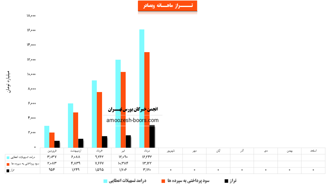 سهم وبصادر (شرکت بانک صادرات) در مهر ماه مبلغ 3,134.7 میلیارد تومان از محل سود تسهیلات خود درآمد داشته و همچنین وبصادر مبلغ 3,037.6 میلیارد تومان سود سپرده پرداخت نموده است. نماد وبصادر در این دوره تراز مثبت 97.1 میلیارد تومان (3%) را ثبت کرده است. تراز بانک در این دوره نسبت به ماه قبل و میانگین ماهانه 89% کاهش و نسبت به دوره 1 ماهه مشابه سال قبل 543% افزایش تراز داشته است.