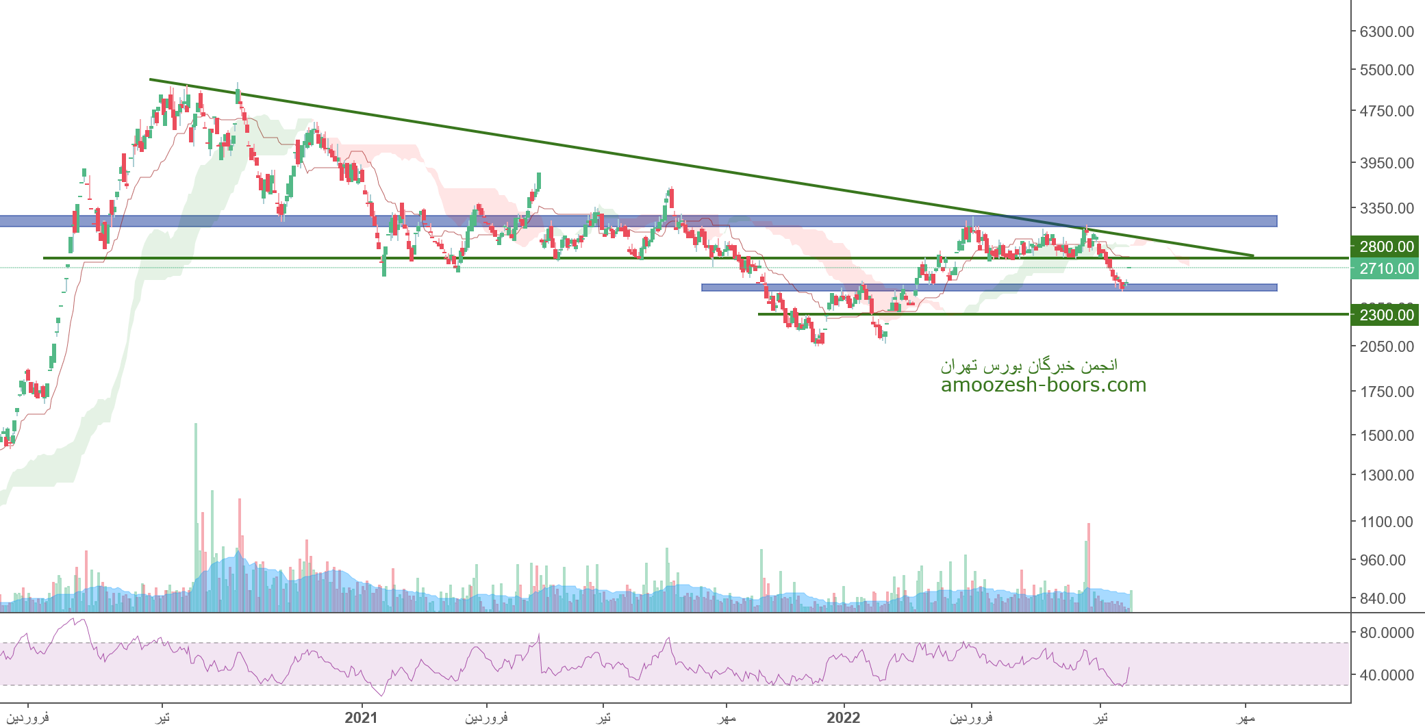 قیمت در حال اصلاح زمانی و در جا زدن در محدوده حمایتی و مقاومتی میباشد در صورتی که قیمت موفق به شکست پر قدرت مقاومت خط داینامیک نزولی در محدوده قیمتی عدد رند و روانی 4000 ریال شود حرکت قیمت تا مقاومت استاتیک 4700 ریال دور از ذهن نخواهد بود و همچنین در صورت از دست رفتن حمایت استاتیک در محدوده قیمتی 3600 ریال حمایت بعدی سهم 3300 ریال در نظر گرفته خواهد شد.