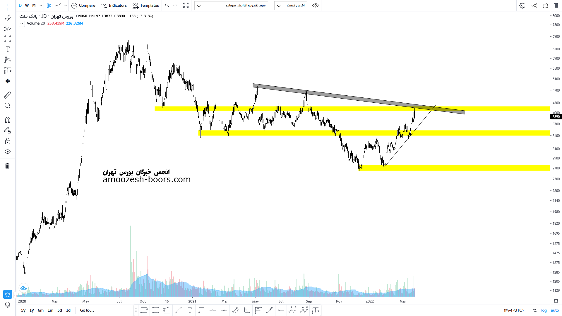 قیمت پس از شکست و تثبیت بالای محدوده مقاومتی ۳۵۰ تومان رشد خود را تا محدوده مقاومتی ۴۱۰ تومان ادامه داده و اکنون به خط روند نزولی خود به این محدوده مقاومتی واکنش منفی نشان داده که نتیجه این واکنش منفی می تواند یک اصلاح در ابتدا تا خط روند صعودی و در صورت شکست تا محدوده حمایتی ۳۵۰ تومان باشد اما در صورت شکست این محدوده مقاومتی مهم قیمت می تواند تا محدوده ۴۹۰ الی ۵۰۰ تومان نیز رشد خود را ادامه دهد.