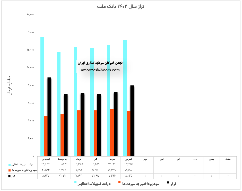 تراز عملیاتی بانک ملت در آبان ماه سال 1402 مثبت 72% اعلام گردیده است که نسبت به ماه گذشته کاهش 22 درصدی تراز عملیاتی را به ثبت رسانده است.