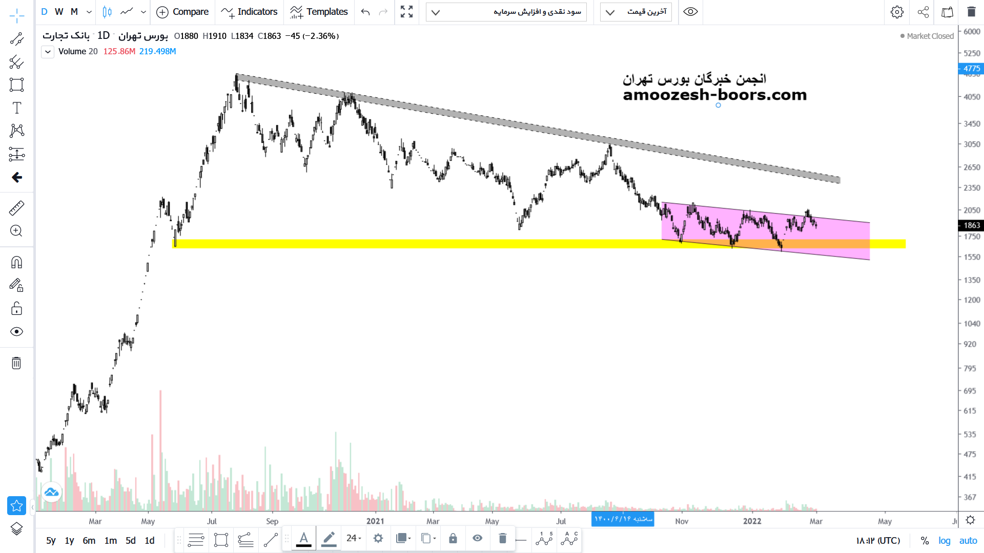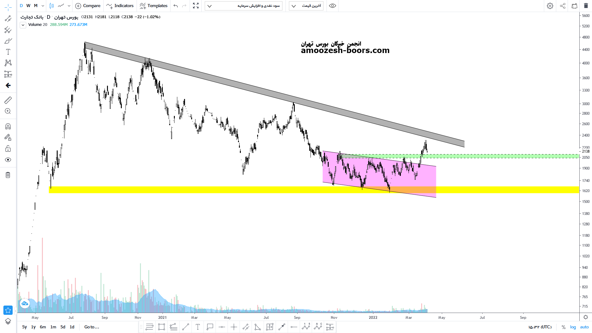 قیمت پس از رشد از محدوده حمایتی ۱۶۰ تومان و تست مجدد محدوده مقاومتی سقف کانال نزولی خود توانسته آن را از بین ببرد اکنون پس از ادامه رشد خود با نزدیک شدن به محدوده مقاومتی خط روند نزولی خود اصلاح کوتاهمدتی را آغاز کرده است که در این بین محدوده حمایتی محدوده ۲۰۵ تومان را همراه خود دارد که در صورت حمایت از این محدوده میتواند مجددا به محدوده مقاومتی خط روند نزولی حملهور شود.