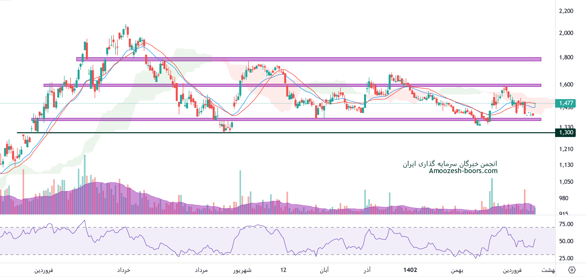 بعد از اصلاحی که روی چارت انجام شده قیمت در حال نزدیک شدن به محدوده امنی میباشد، محدوده حمایت وتجارت محدوده 1400 ریال ارزیابی میگردد، در صورت تثبیت قیمت در این محدوده و ثبت کندل های مثبت، میتوان انتظار حرکت قیمت تا محدوده 1600 ریال را داشت، همچنین در صورت ادامه دار شدن اصلاح و از دست رفتن حمایت نماد وتجارت که در بالا ذکر شد، حمایت بعدی 1300 ریال خواهد بود.