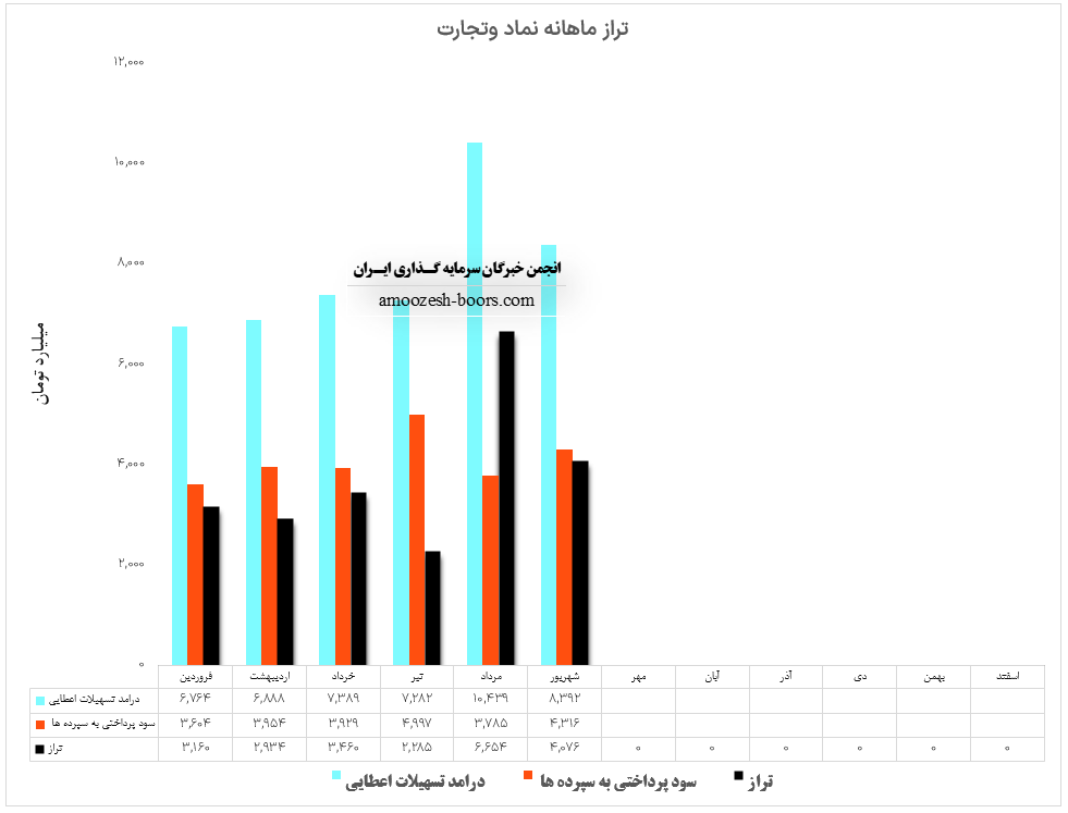 نماد وتجارت (بانک تجارت) در شهریور ماه سال 1402 حدود مبلغ 8392 میلیارد تومان درآمد داشته که این میزان در مقایسه با ماه گذشته 20% کاهش پیدا کرده است. همچنین سهم وتجارت در شهریور ماه مبلغ 4316 میلیارد تومان به سپردههای خود سود پرداخت کرده که این میزان با افزایش 14 درصدی نسبت به ماه گذشته روبرو شده است. و لذا با توجه به آمار مذکور تراز وتجارت با 39% کاهش نسبت به ماه گذشته به مثبت 4076 میلیارد تومان رسیده است.
