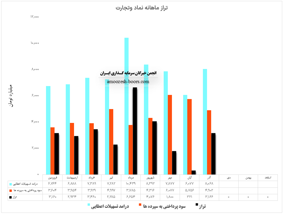 نماد وتجارت (بانک تجارت) در آذر ماه سال 1402 حدود مبلغ 8068 میلیارد تومان درآمد داشته که این میزان در مقایسه با ماه گذشته 33% افزایش پیدا کرده است. همچنین سهم وتجارت در آذر ماه مبلغ 4902 میلیارد تومان به سپردههای خود سود پرداخت کرده که این میزان با کاهش 15 درصدی نسبت به ماه گذشته روبرو شده است. و لذا با توجه به آمار مذکور تراز وتجارت با 886% افزایش نسبت به ماه گذشته به مثبت 3166 میلیارد تومان رسیده است.