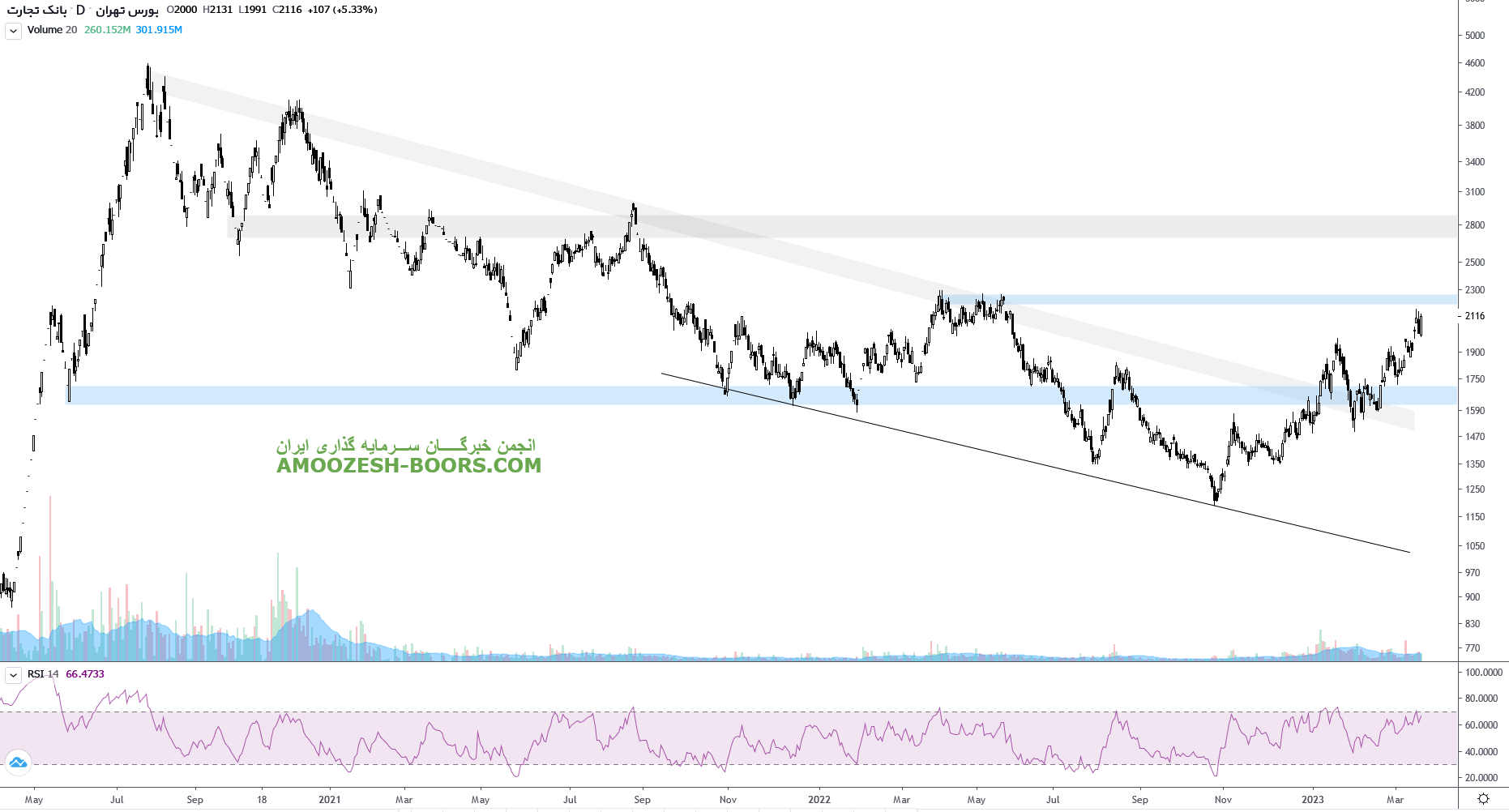 قیمت سهام وتجارت پس از برگشت مجدد به بالای حمایت ناحیه ۱۶۰ تومان رشد خود را آغاز کرده و اکنون نزدیک مقاومت ناحیه ۲۲۰ تومان میباشد در صورت عبور از این ناحیه مقاومت بعدی سهم وتجارت ناحیه ۲۸۰ تومان تعیین شده است اما در صورت بروز واکنش منفی نسبت به این ناحیه مقاومتی اولین حمایت سهم وتجارت ناحیه ۱۶۵ تومان تعیین شده است که میتواند با بروز واکنش مثبت نسبت به این ناحیه مجددا وارد مدار رشد شود.