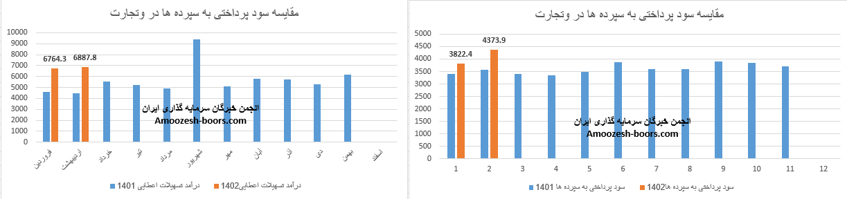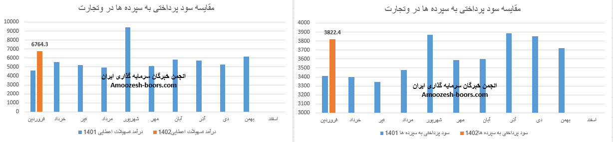 نماد وتجارت در عملکرد سالانه با افزایش 50 درصدی درآمد تسهیلات اعطائی همراه بوده است، به تناسب رشد درآمد هزینه پرداختی سود سپرده های بانک تجارت نیز 32% رشد داشته است، همچنین جمع درآمد های عملیاتی سهم وتجارت 89%، سود خالص 309% و EPS وتجارت با رشد خوب 308 درصدی همراه بوده است، تراز عملیاتی وتجارت در سال 1401 به 23 همت رسیده که رشد 96 درصدی نسبت به سال قبل دارد، روند منابع سپرده ای بانک و مطالبات بانک تجارت به شرح نمودار ( شاره یک و دو ) زیر میباشد.