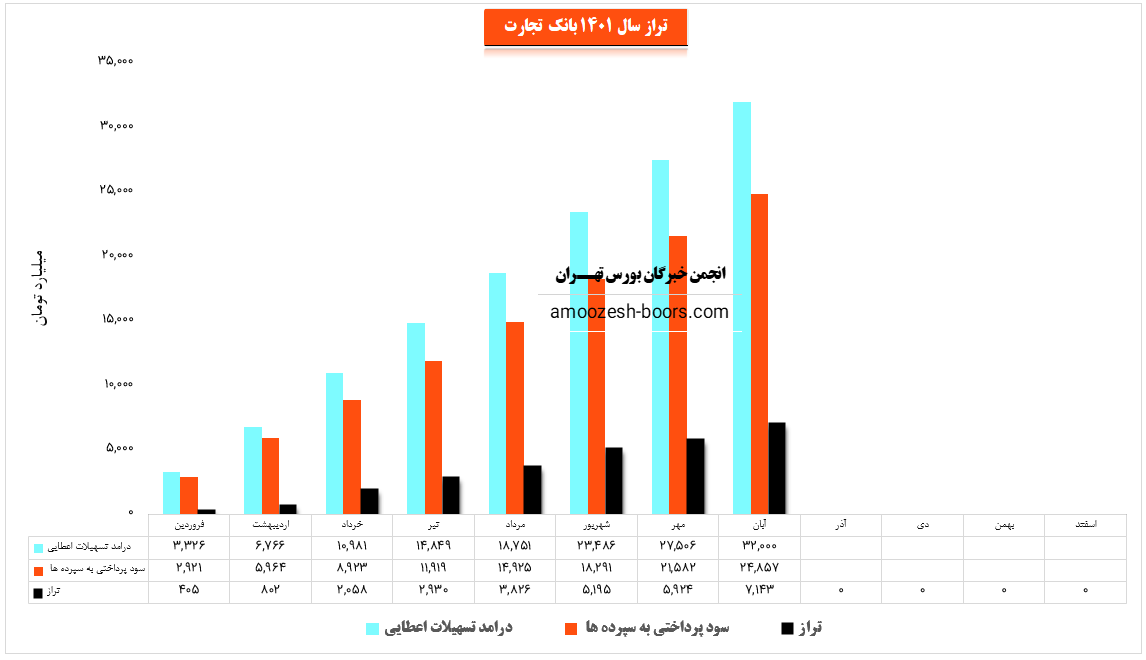 نماد وتجارت (بانک تجارت) در آبان ماه سال 1401 حدود مبلغ 32/000 میلیارد تومان از محل تسهیلات اعطایی به افراد درآمد داشته که این میزان در مقایسه با ماه گذشته 16% افزایش پیدا کرده است.