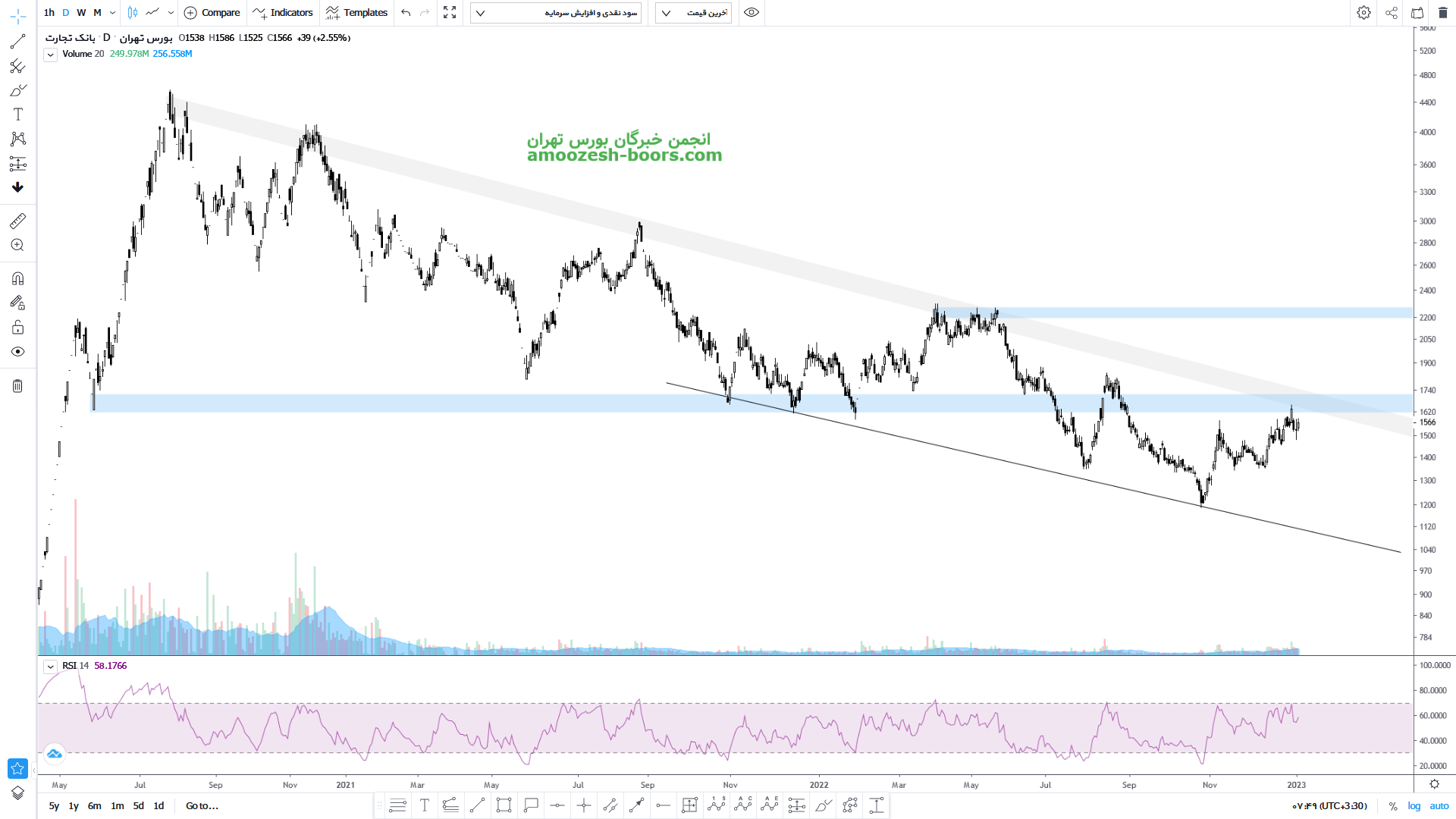 قیمت سهم وتجارت اکنون بر روی مقاومت بسیار مهم و حساسی قرار گرفته است. این مقاومت مهم که ناحیه ۱۷۰ تومان می باشد سقف کانال نزولی دراز مدت این سهم است. در صورت توانایی عبور قیمت از این مقاومت مهم، مقاومت بعدی سهم و تجارت ناحیه ۲۲۰ تومان در نظر گرفته شده است اما در صورت اصلاح، اولین حمایت سهم وتجارت ناحیه کف ۱۲۰ تومان میباشد.