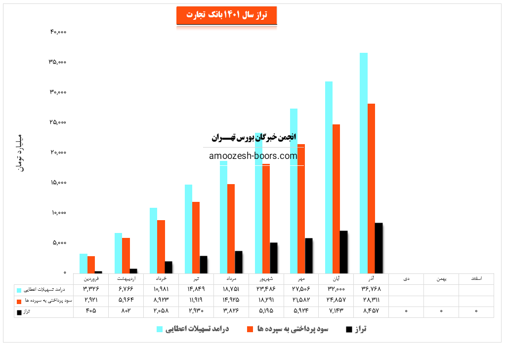 نماد وتجارت (بانک تجارت) در آذر ماه سال 1401 بصورت تجمیعی حدود مبلغ 36768 میلیارد تومان از محل تسهیلات اعطایی به افراد درآمد داشته که این میزان در مقایسه با ماه گذشته 15% افزایش پیدا کرده است.
