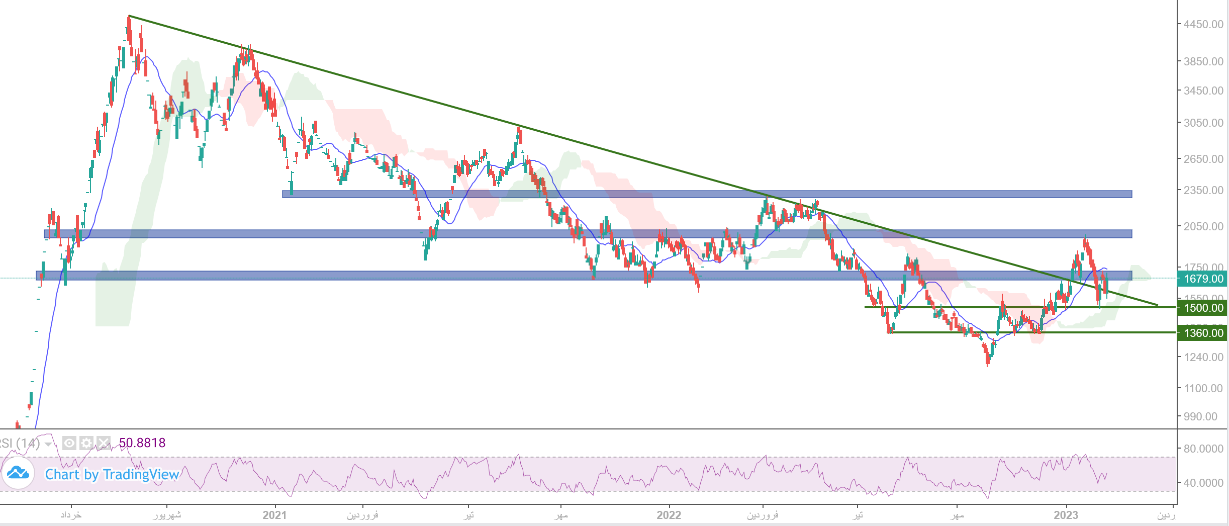 00نماد وتجارت که موفق به شکست خط روند نزولی خود شده در حال حاضر درگیر محدوده مقاومتی 1700 ریال میباشد، در صورت عبور از این مقاومت، حرکت سهم تا محدوده 2000 ریال محتمل خواهد بود، همچنین در صورت اصلاح، حمایت های سهم به ترتیب 1500 و 1360 ریال ارزیابی میگردند.