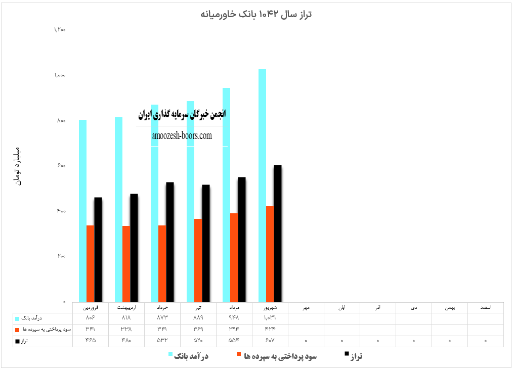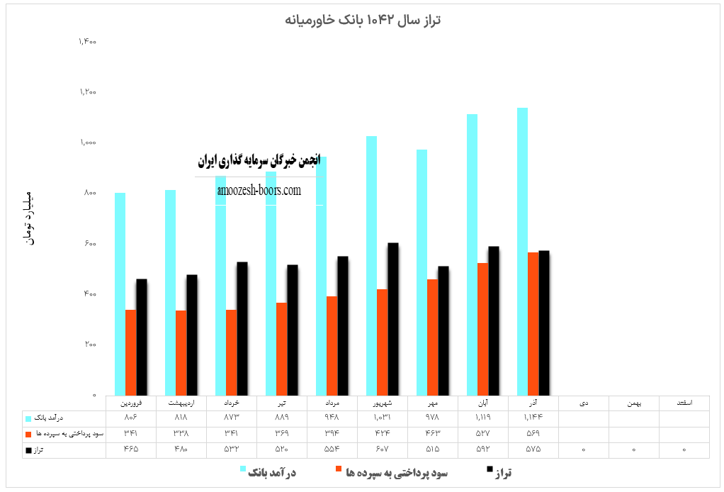 سهم وخاور (بانک خاورمیانه) در آذر ماه سال 1402 حدود 1144 میلیارد تومان درآمد داشته که در مقایسه با ماه گذشته حدود 2% رشد پیدا کرده است. نماد وخاور در این ماه از درآمد های کسب شده خود حدود بیش از 569 میلیارد تومان به سپرده های خود سود پرداخت کرده که در مقایسه با ماه گذشته حدود 8% رشد پیدا کرده است. با توجه به آمار مذکور تراز بانک خاورمیانه (نماد وخاور) در آذر ماه با 3% کاهش نسبت به ماه گذشته مثبت 575 میلیارد تومان به ثبت رسیده است.
