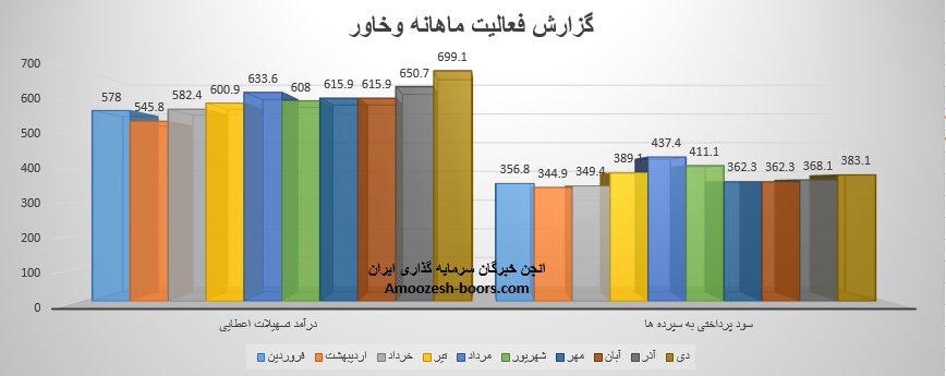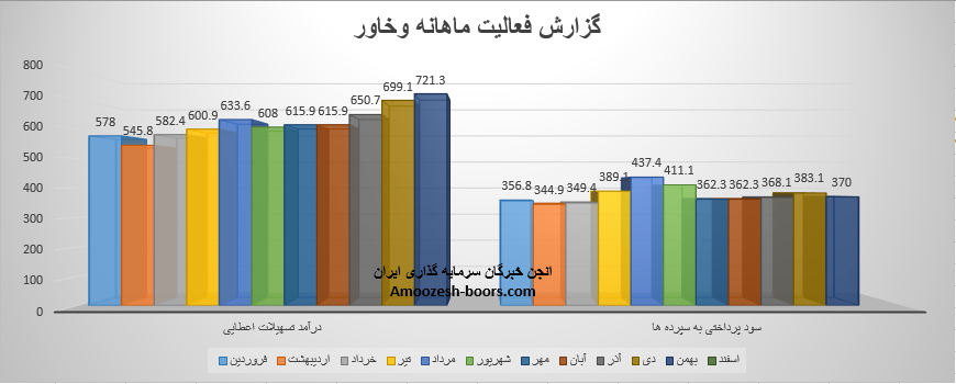 نماد وخاور در بهمن ماه روند صعودی کسب درآمد را حفظ نموده و موفق به ثبت رکورد در گزارش فعالیت ماهانه خود گردیده است، این بانک تراز خود را 82% اعلام نموده که از طریق دریافت مبلغ 699.1 میلیارد تومان دریافتی و 383.1 میلیارد تومان پرداختی به دست آورده است، تراز تجمیعی عملکرد 10 ماهه مثبت 62% بوده که نسبت به عملکرد تاریخی خود و سابر هم گروهان عملکرد عالی میباشد.