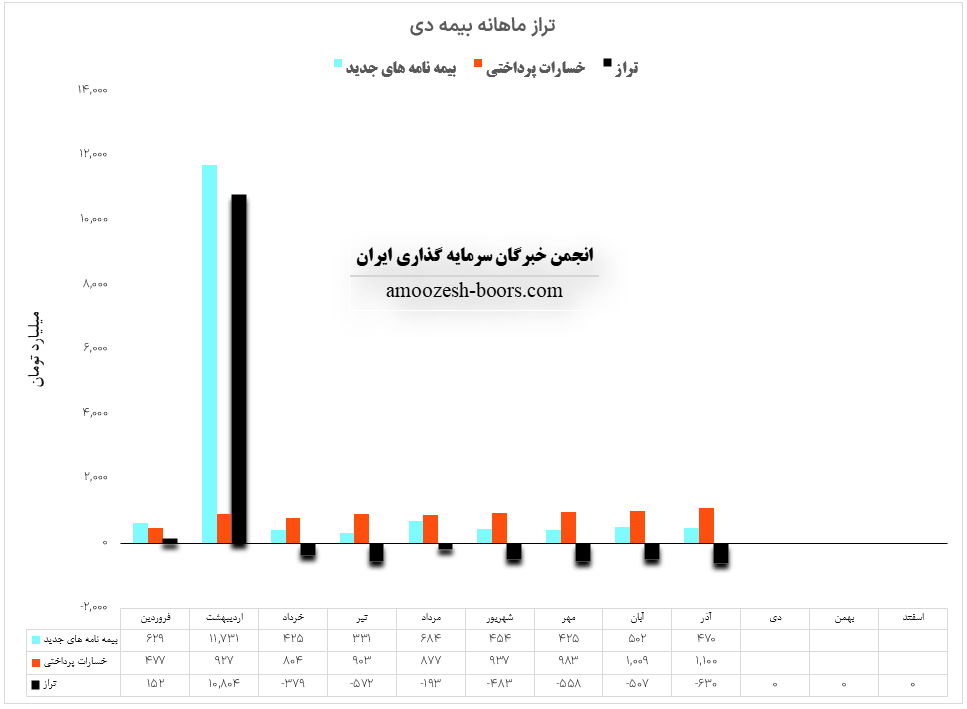 همچنین نماد ودی در آذر ماه مبلغ 1100 میلیارد تومان به بیمه نامه های خود خسارت پرداخت کرده که این میزان با افزایش 9 درصدی نسبت به ماه گذشته روبرو شده و لذا با توجه به آمار مذکور تراز این شرکت با 24 درصد رشد در ماه گذشته به منفی 630 میلیارد تومان در این ماه تبدیل شده است.