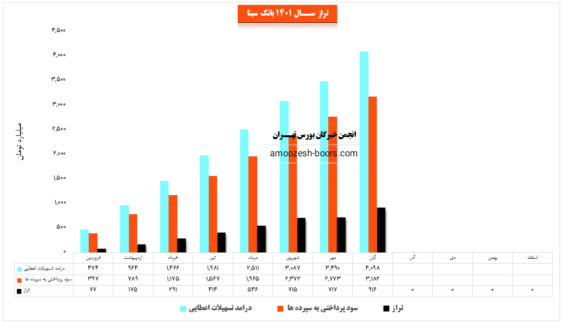 سهم وسینا (بانک سینا) در آبان ماه سال 1401 حدود مبلغ 4098 میلیارد تومان از محل تسهیلات اعطایی به افراد درآمد داشته که این میزان در مقایسه با ماه گذشته 17% افزایش پیدا کرده است.