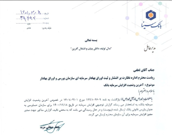همچنین بانک در خصوص وضعیت افزایش سرمایه خود طی نامه زیر افشای اطلاعات داشته است .