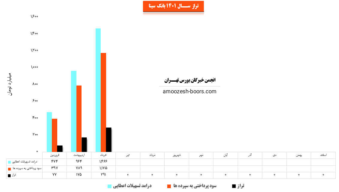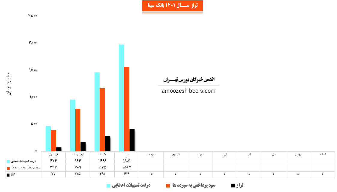 سهم وسینا (بانك سينا) در تیر ماه سال 1401 حدود مبلغ 1981 میلیارد تومان از محل تسهیلات اعطایی به افراد درآمد داشته که این میزان در مقایسه با ماه گذشته 35% افزایش پیدا کرده است.