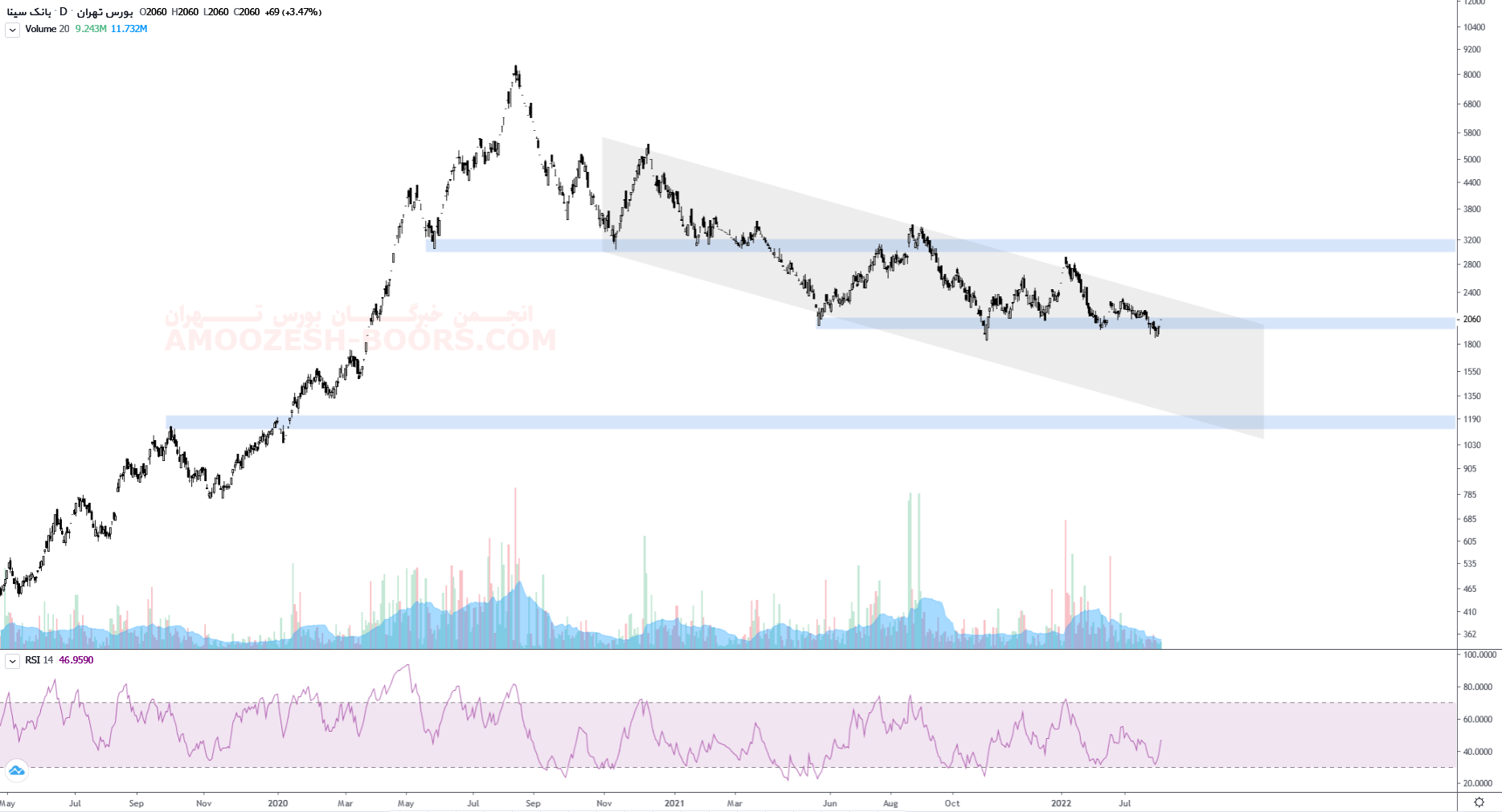 قیمت سهم وسینا پس از برخورد به ناحیه حمایتی مهم 200 تومان میتواند در صورت حمایت و شکست و خروج از سقف کانال نزولی رشد خود را تا ناحیه مقاومتی مهم 315 تومان ادامه دهد. اما درصورت از دست رفتن ناحیه حمایتی مهم 200 تومان قیمت میتواند خود را به ناحیه کف کانال نزولی نیز برساند .