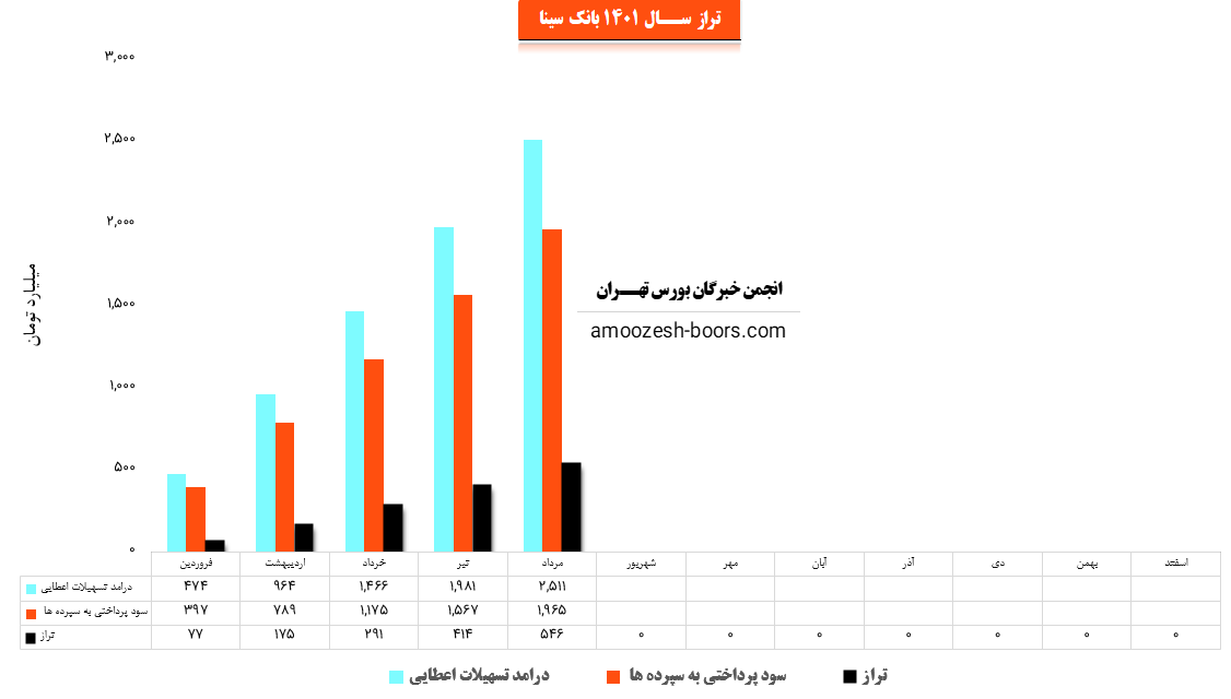 سهم وسینا (بانك سينا) در مرداد ماه سال 1401 حدود مبلغ 2511 میلیارد تومان از محل تسهیلات اعطایی به افراد درآمد داشته که این میزان در مقایسه با ماه گذشته 27% افزایش پیدا کرده است.