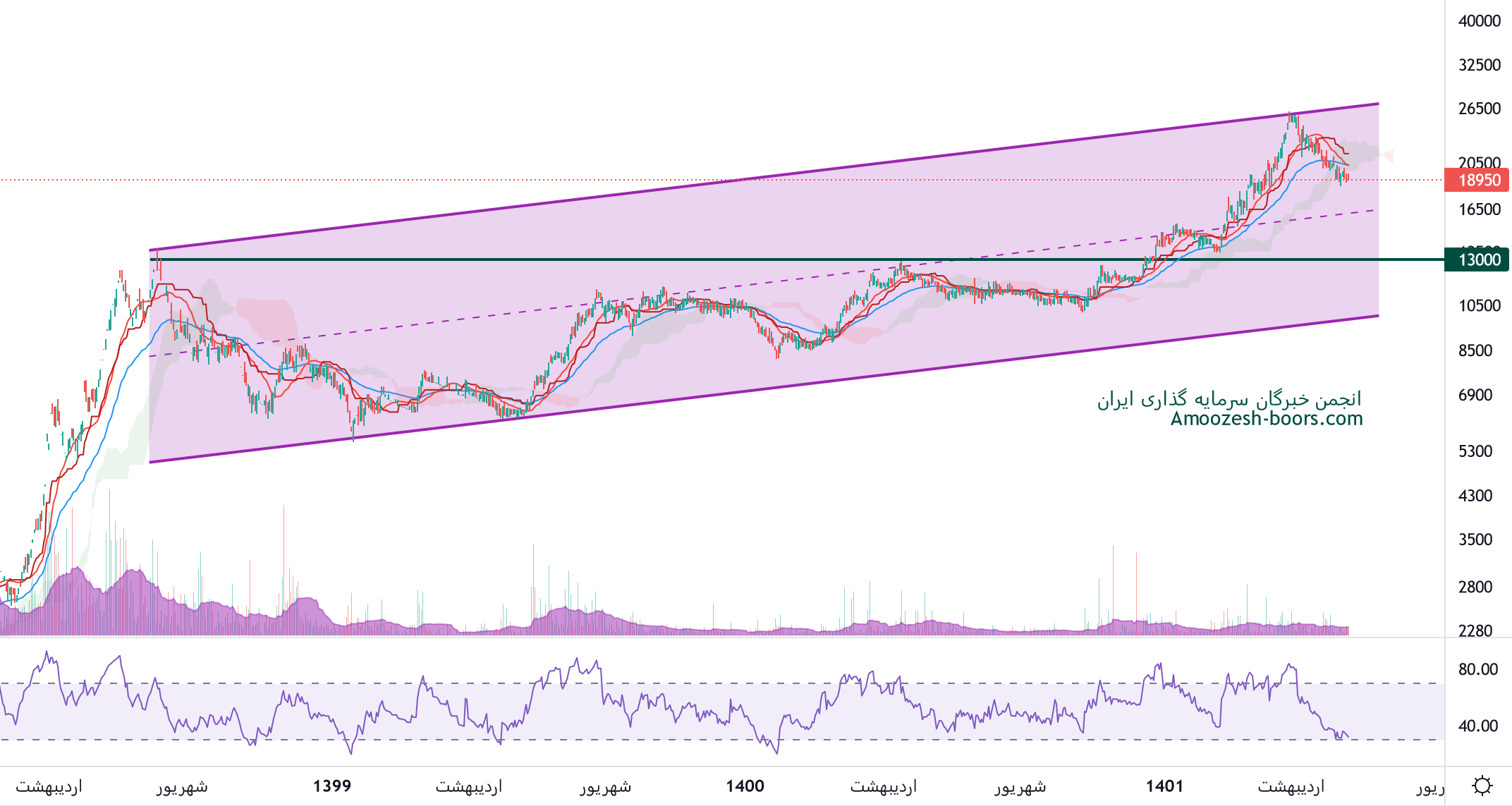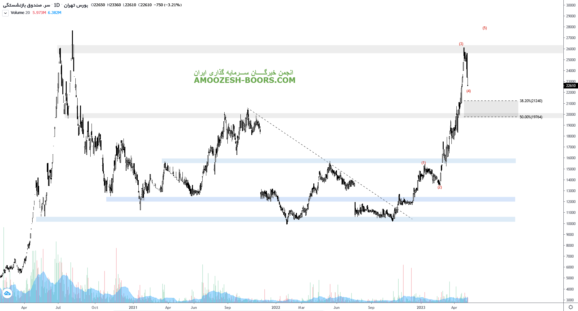 نماد وصندوق که در کانال بلند مدت صعودی قرار دارد، در حال حاضر در حال طی کردن اصلاح خود میباشد و به محدوده حمایتی میدلاین کانال در قیمت 16000 ریال نزدیک شده است، در صورت تثبیت و بیس سازی قیمت سهم وصندوق در این ناحیه حرکت سهم تا سقف کانال در محدوده 27000 ریال محتمل خواهد بود، همچنین در صورت از دست رفتن محدوده حمایتی ذکر شده، حمایت بعدی 13000 ریال در نظر گرفته خواهد شد.