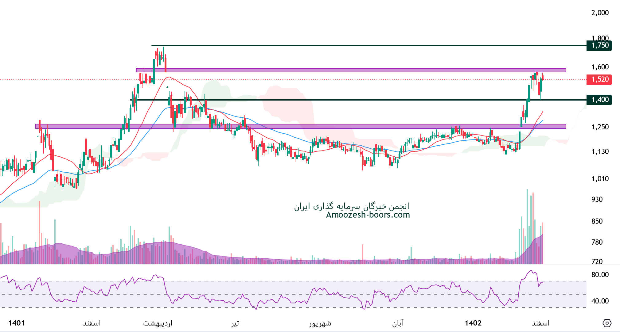 همانطور که در تحلیل تکنیکال وصنعت میبینیم قیمت در محدوده حمایتی 1400 ریال و محدوده مقاومتی 1600 ریال در حال نوسان میباشد.