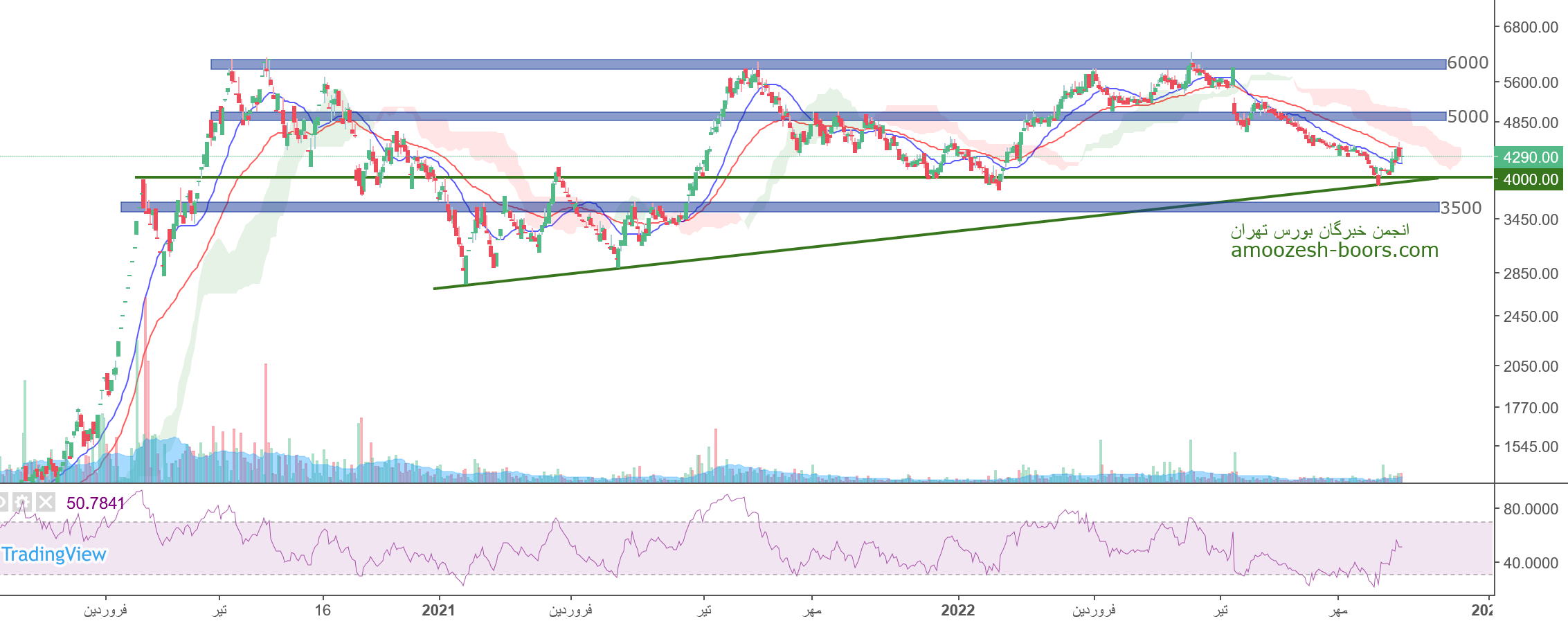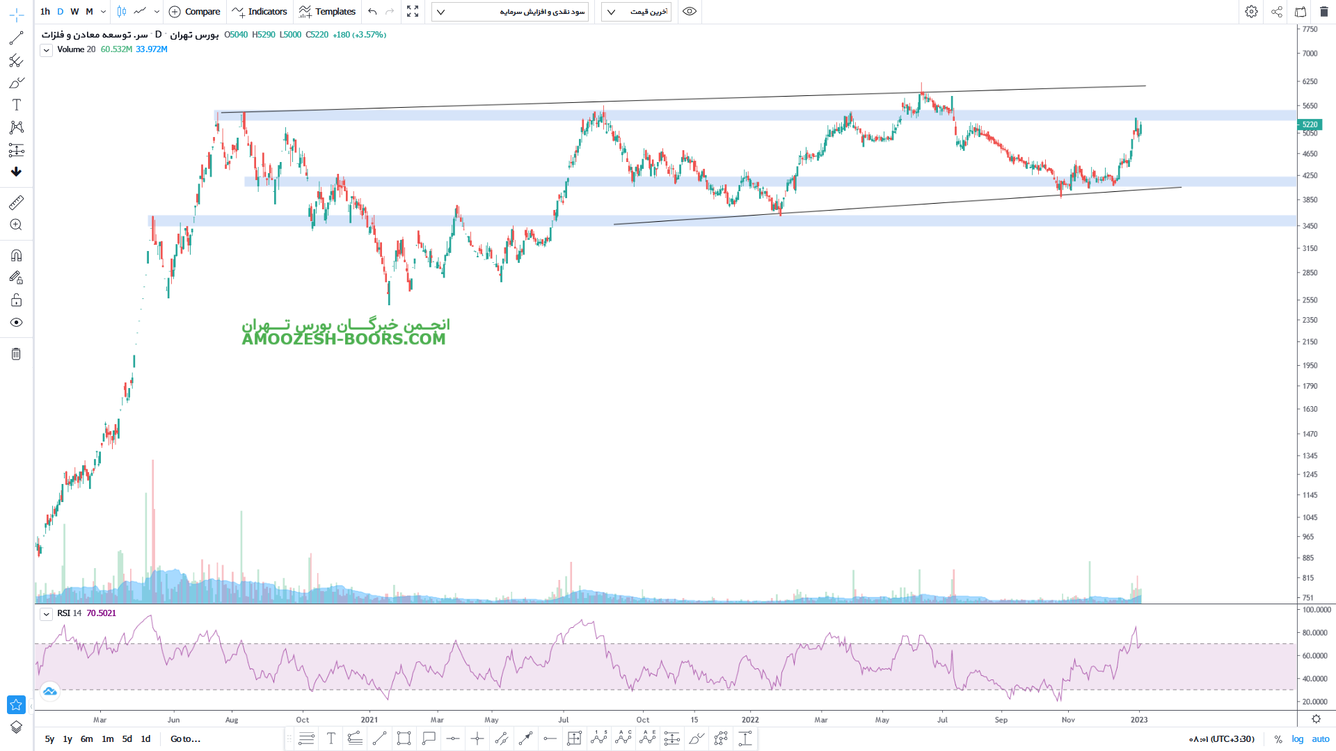 قیمت سهم ومعادن در حال حاضر مقاومت 5000 ریال را پیش رو دارد، در صورت عبور از این مقاومت، حرکت سهم تا 6000 ریال دور از ذهن نخواهد بود، همچنین در صورت ورود سهم به فاز اصلاحی، اولین حمایت سهم ومعادن 4000 ریال در نظر گرفته خواهد شد.