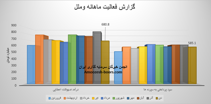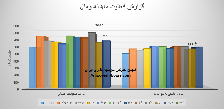 نماد وملل در بهمن ماه از محل سرمایه گذاری و کارمزد های دریافتی و همچنین سپرده گذاری ها به درآمد 711.5 میلیارد تومانی رسیده، باید در نظر داشت سهم وملل معادل 611.5 میلیارد تومان این درآمد را به عنوان هزینه پرداخت نموده است، با این حال با تکرار تراز ماه گذشته، تراز عملکرد خود را مثبت 16% گزارش نموده است، از ابتدای سال مالی تا انتهای 11 ماهه عملکرد تجمیعی وملل تراز مثبت 22% گزارش شده است.